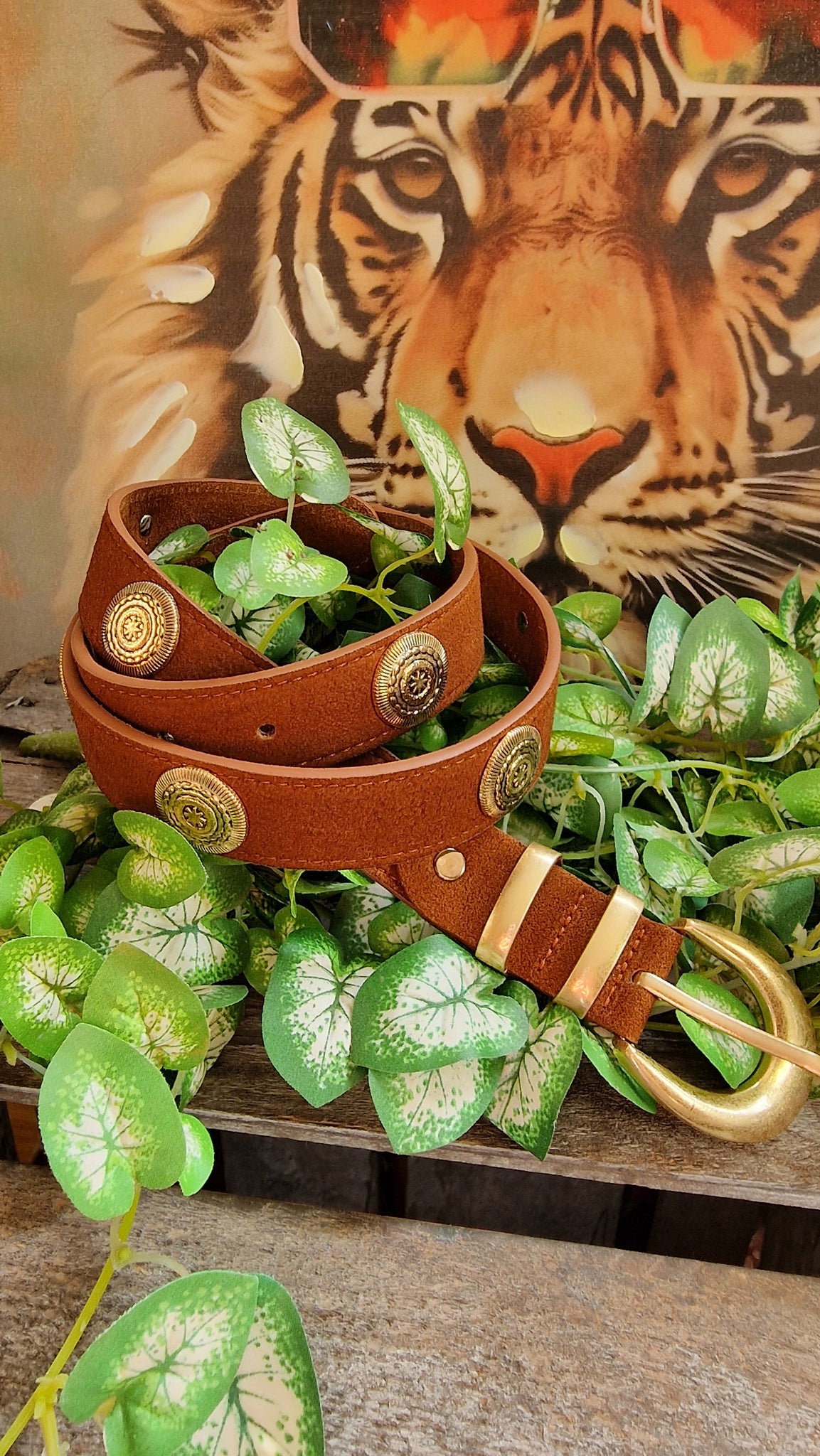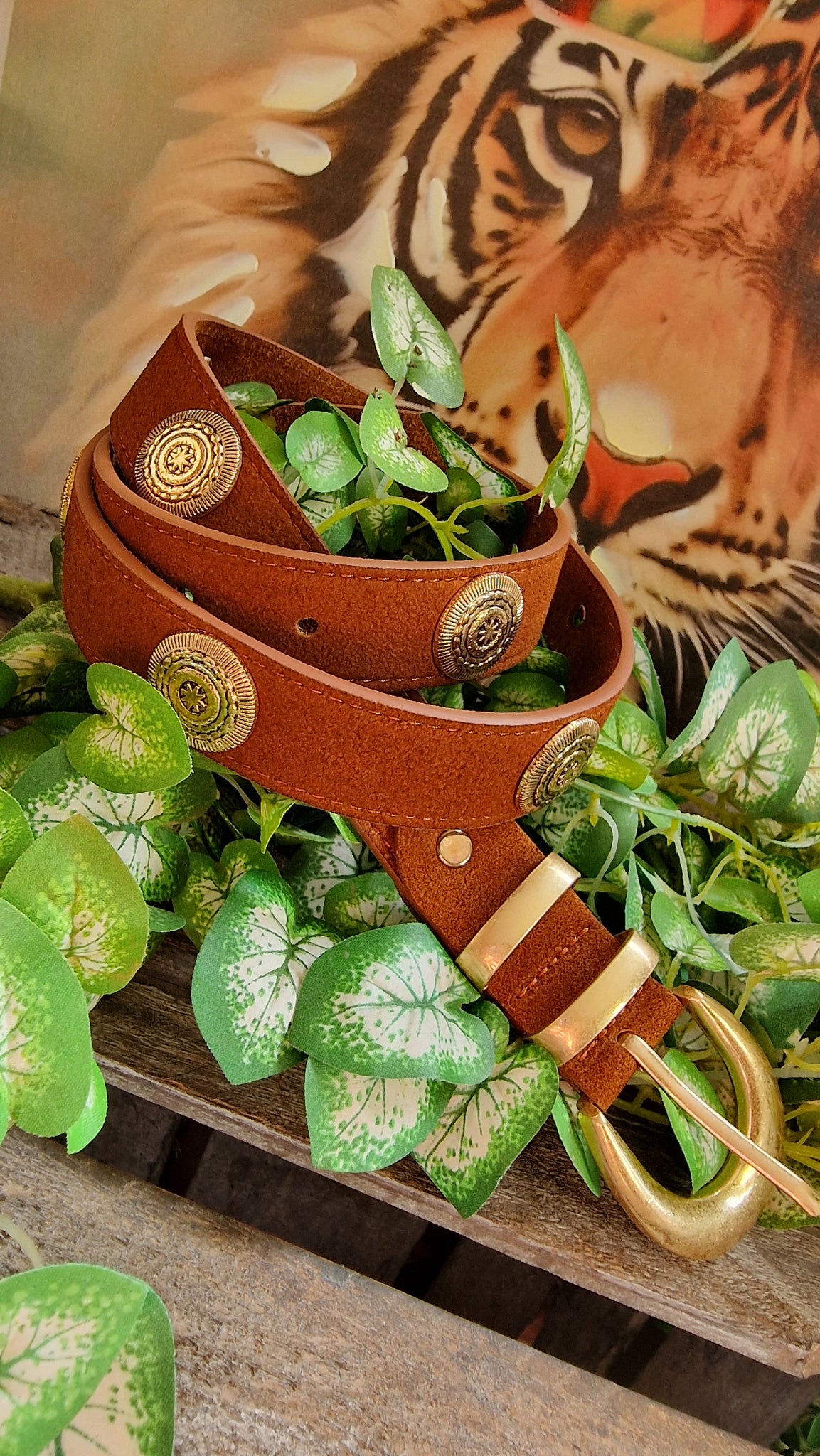 Ceinture camel en daim avec œillets fantaisies.
