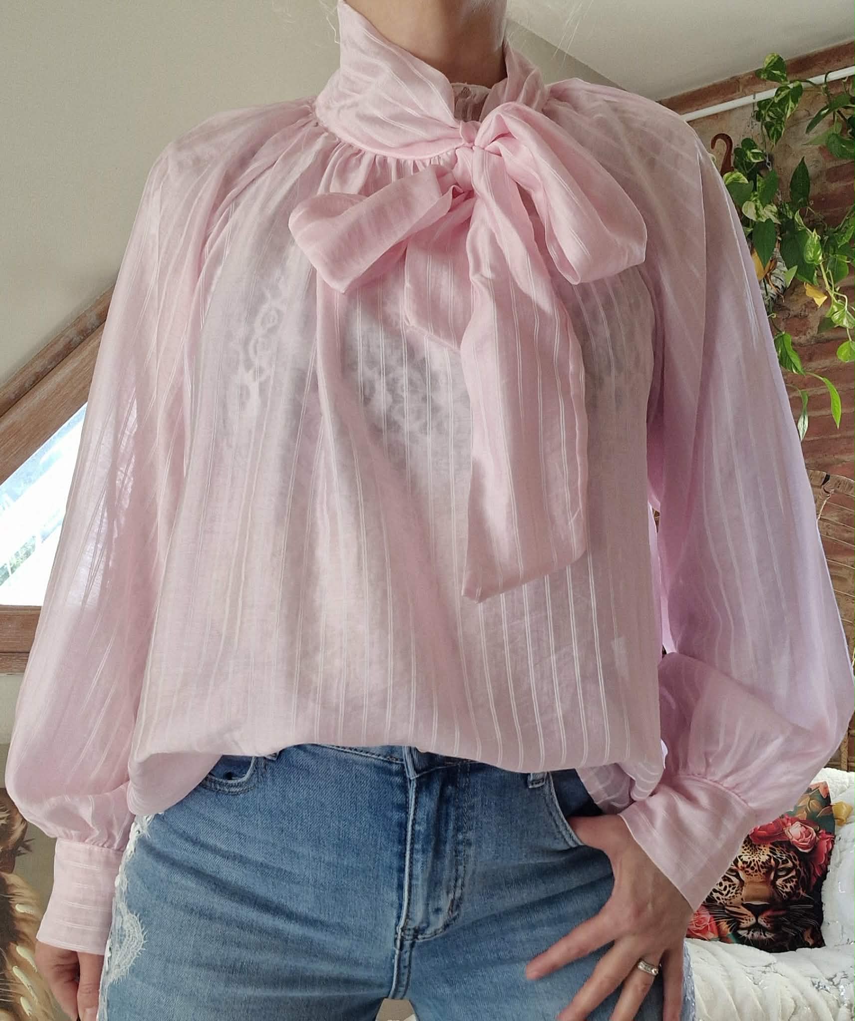 Blouse Nana rose à fine rayures , manches bouffantes et nœud à nouer devant.