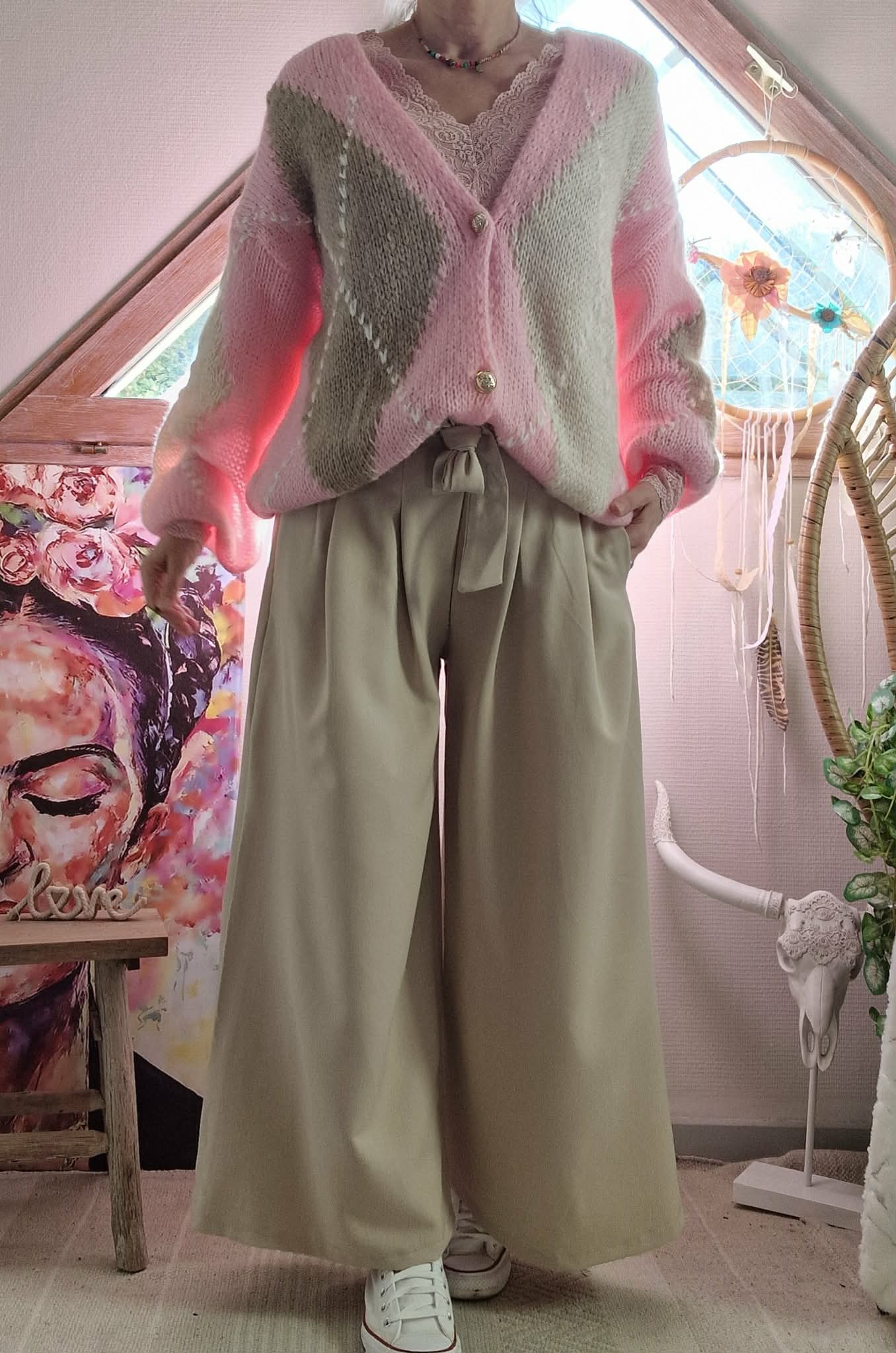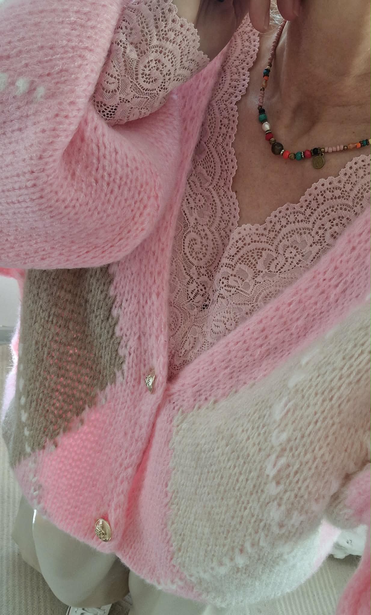 Gilet Arthur rose / beige / sable motifs jacquard oversize bouton devant.