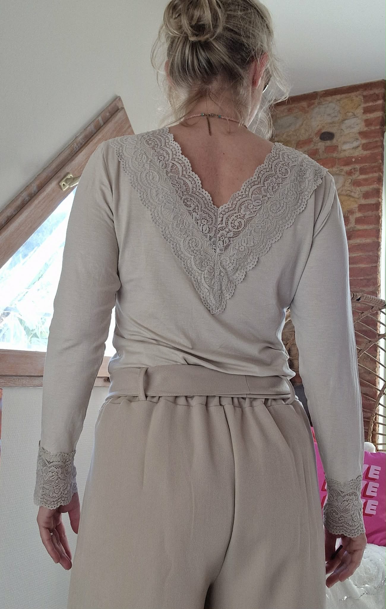 Sous-pull Ariana beige avec dentelles en V devant et dos. Manches longues avec dentelle au poignet.