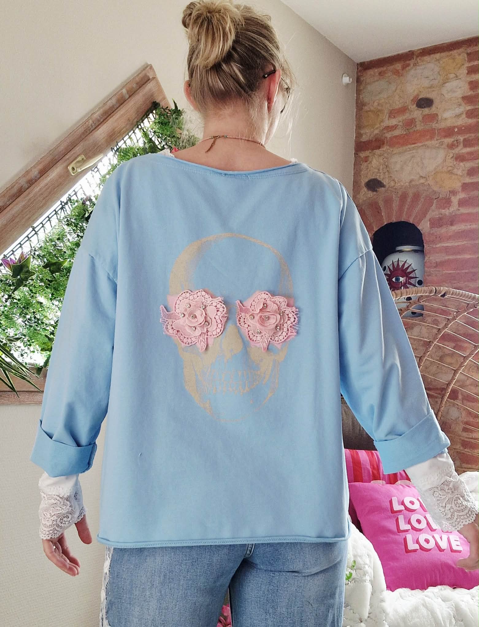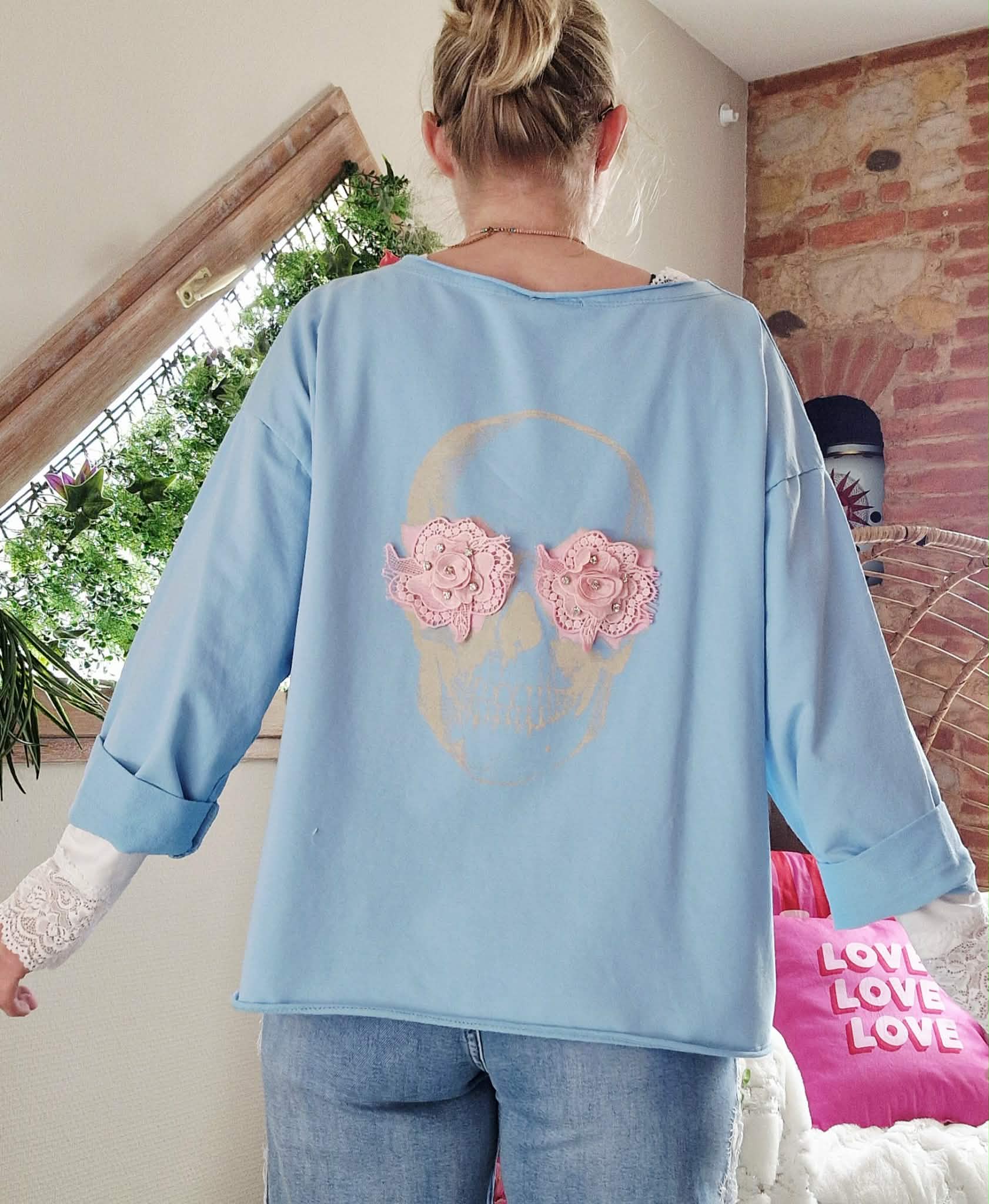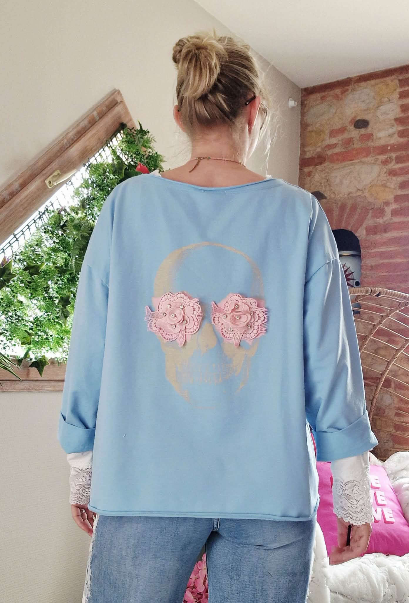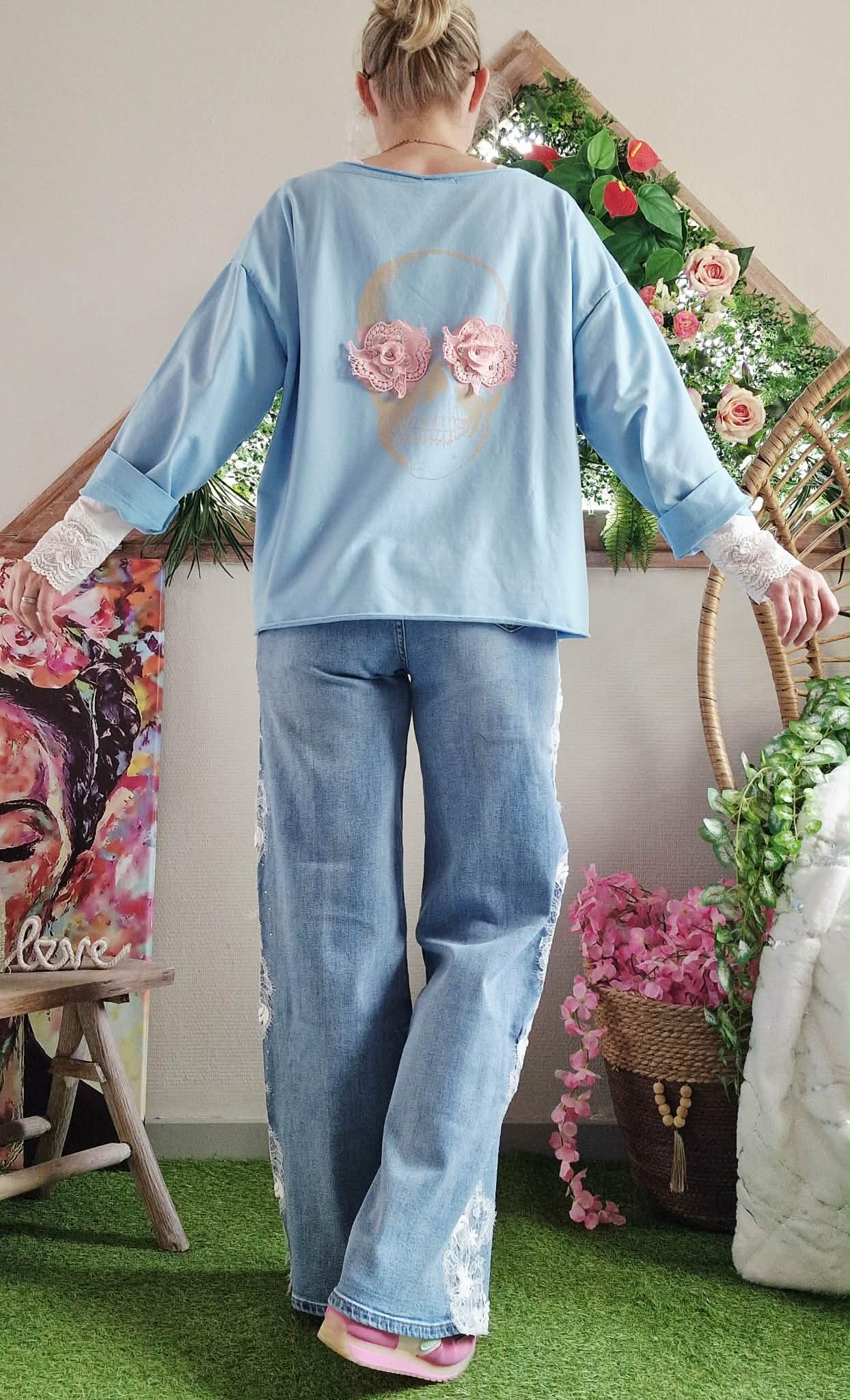 Haut Skull bleu ciel avec dessin poitrine et dos ( œil dentelle)