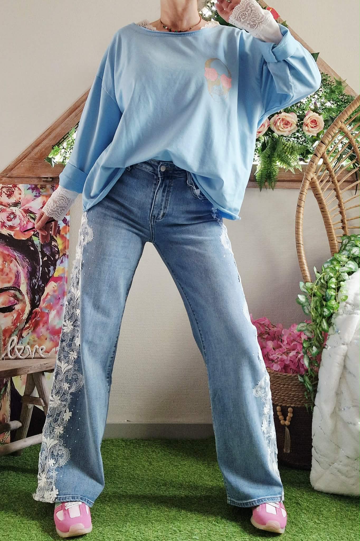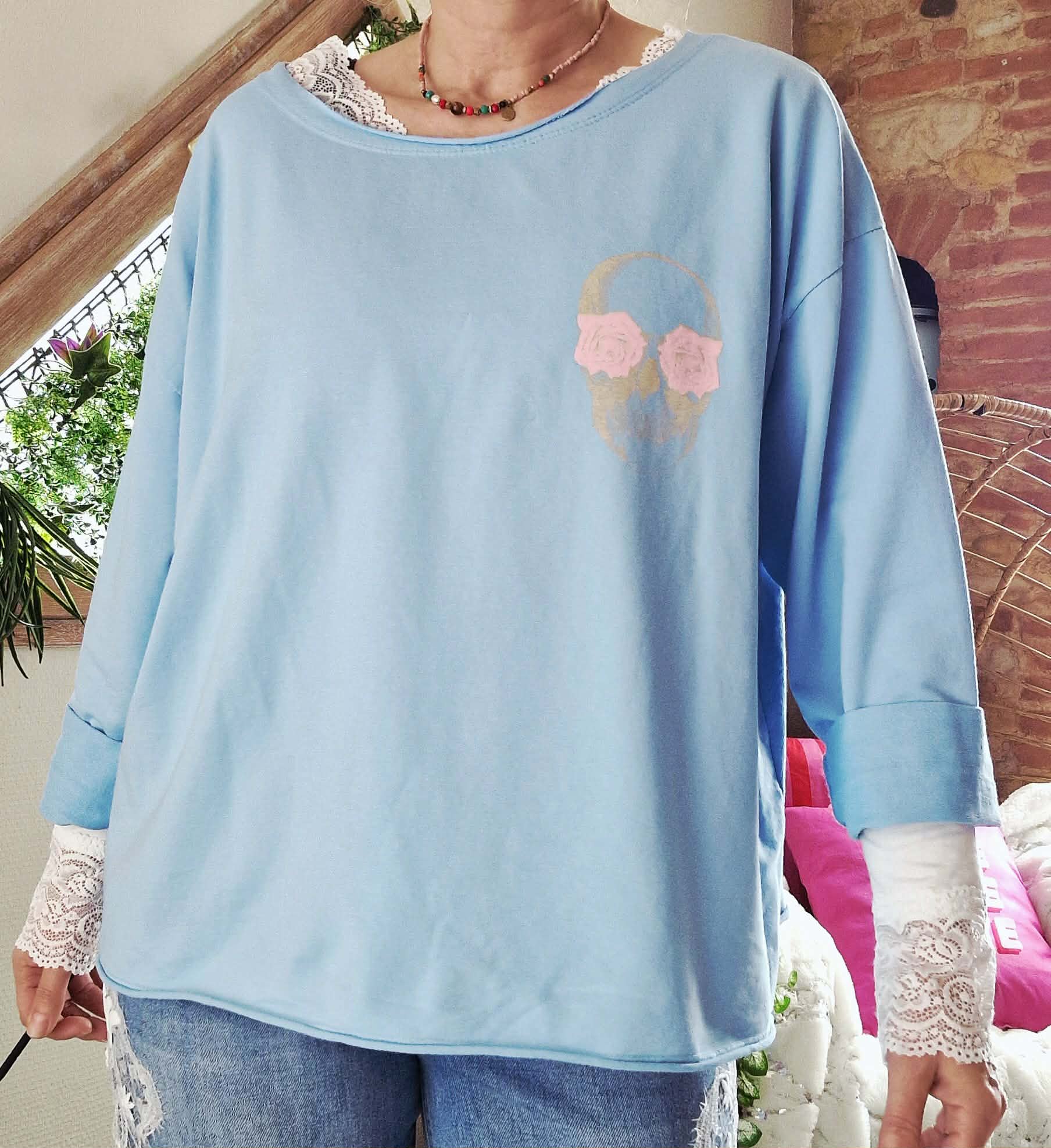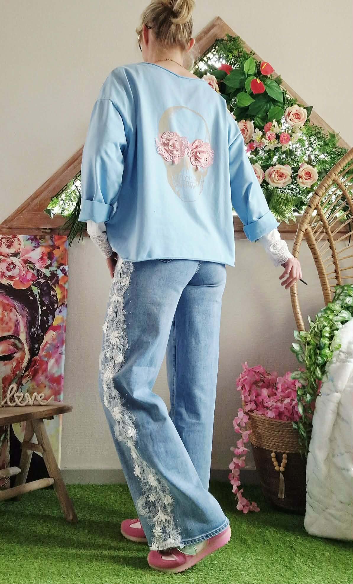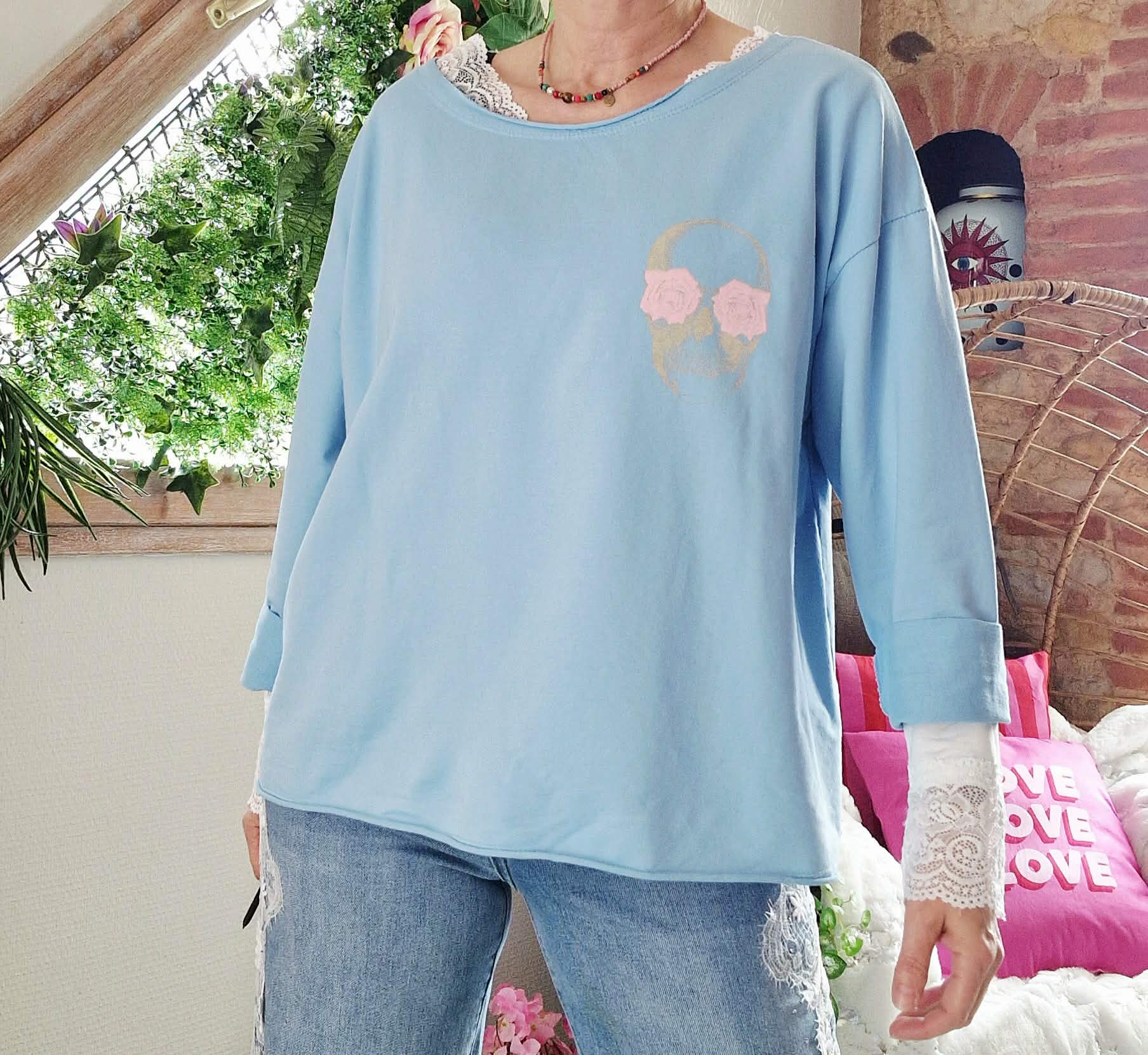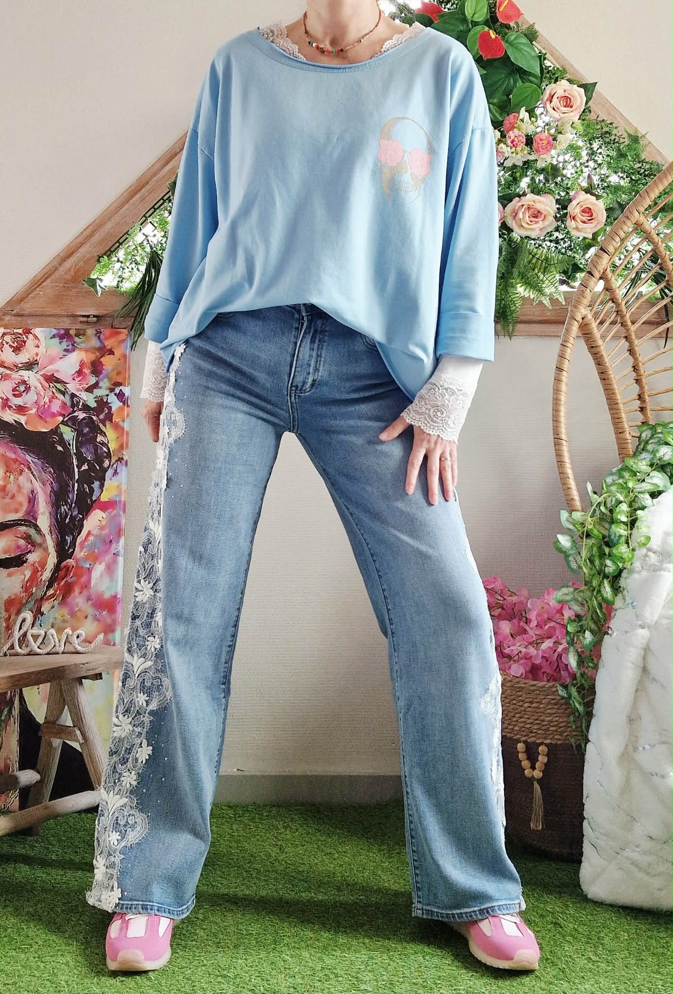 Haut Skull bleu ciel avec dessin poitrine et dos ( œil dentelle)
