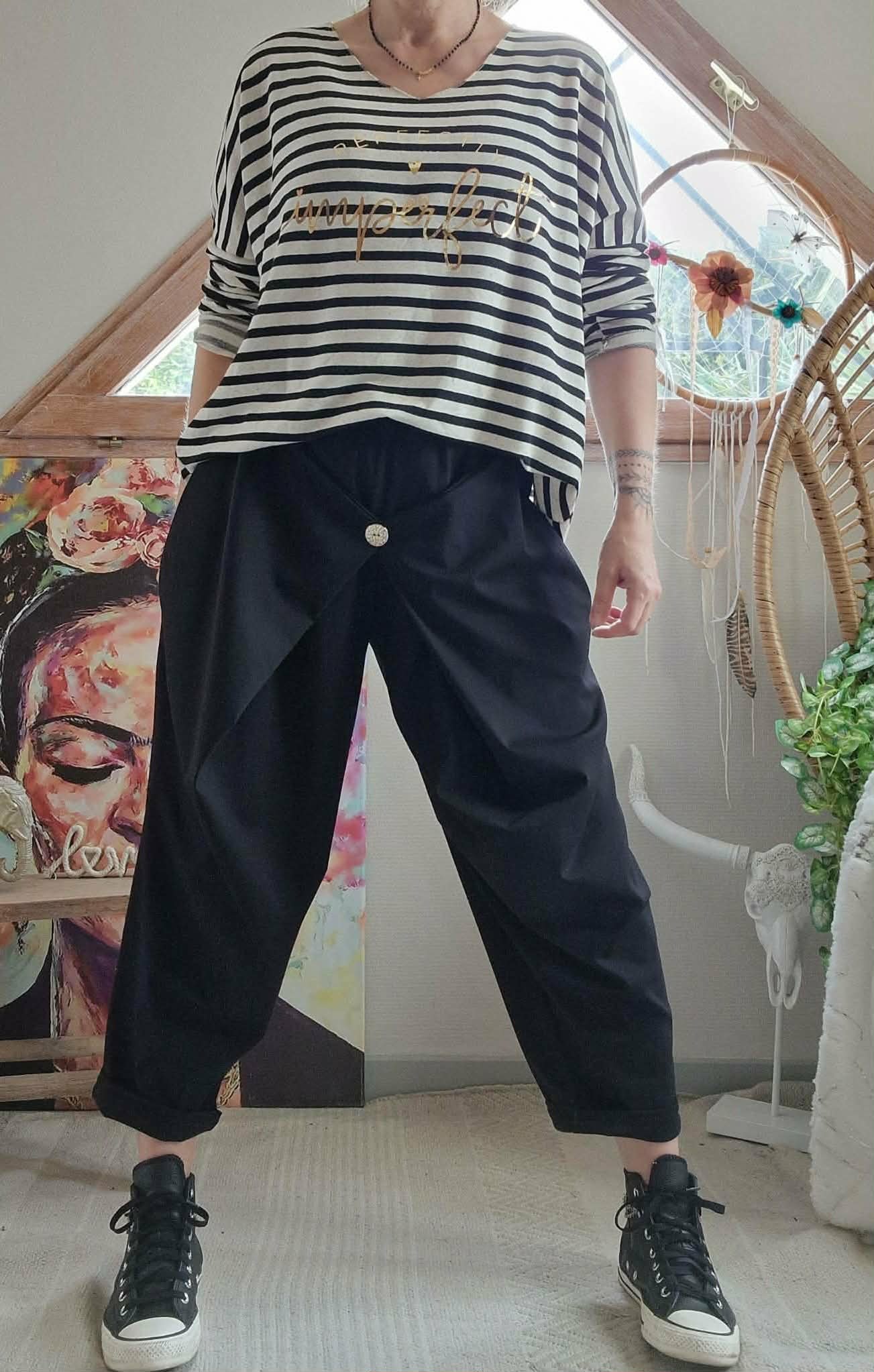 Matière extensible 60% coton, 20% viscose, 5% elasthan et 15% lino .