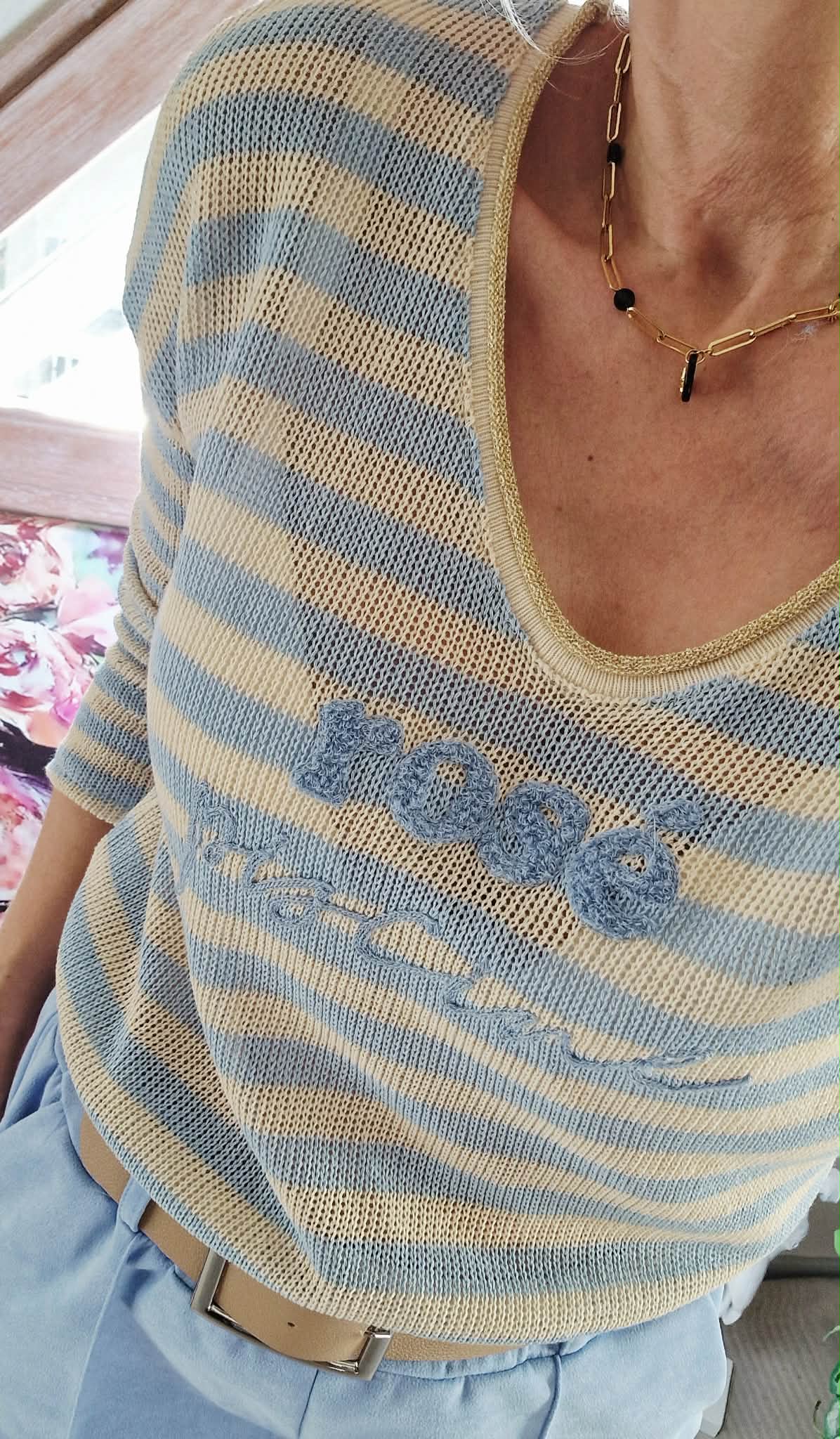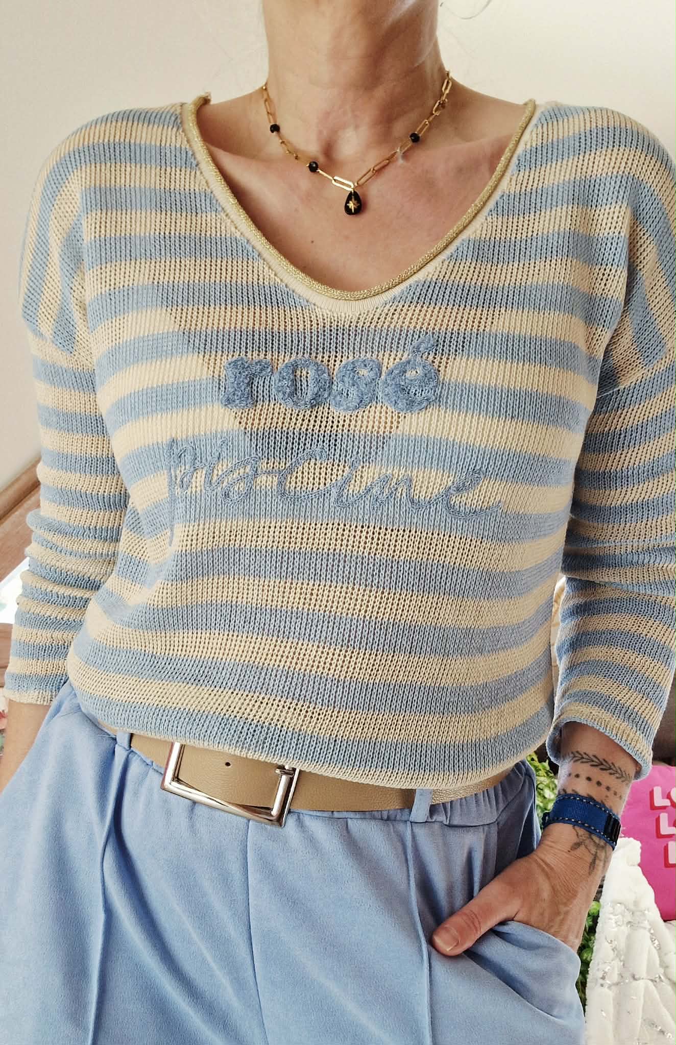Haut Rosé Piscine bleu/beige , col V manches longues.