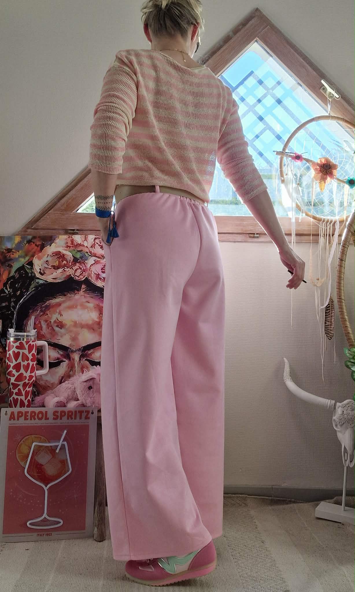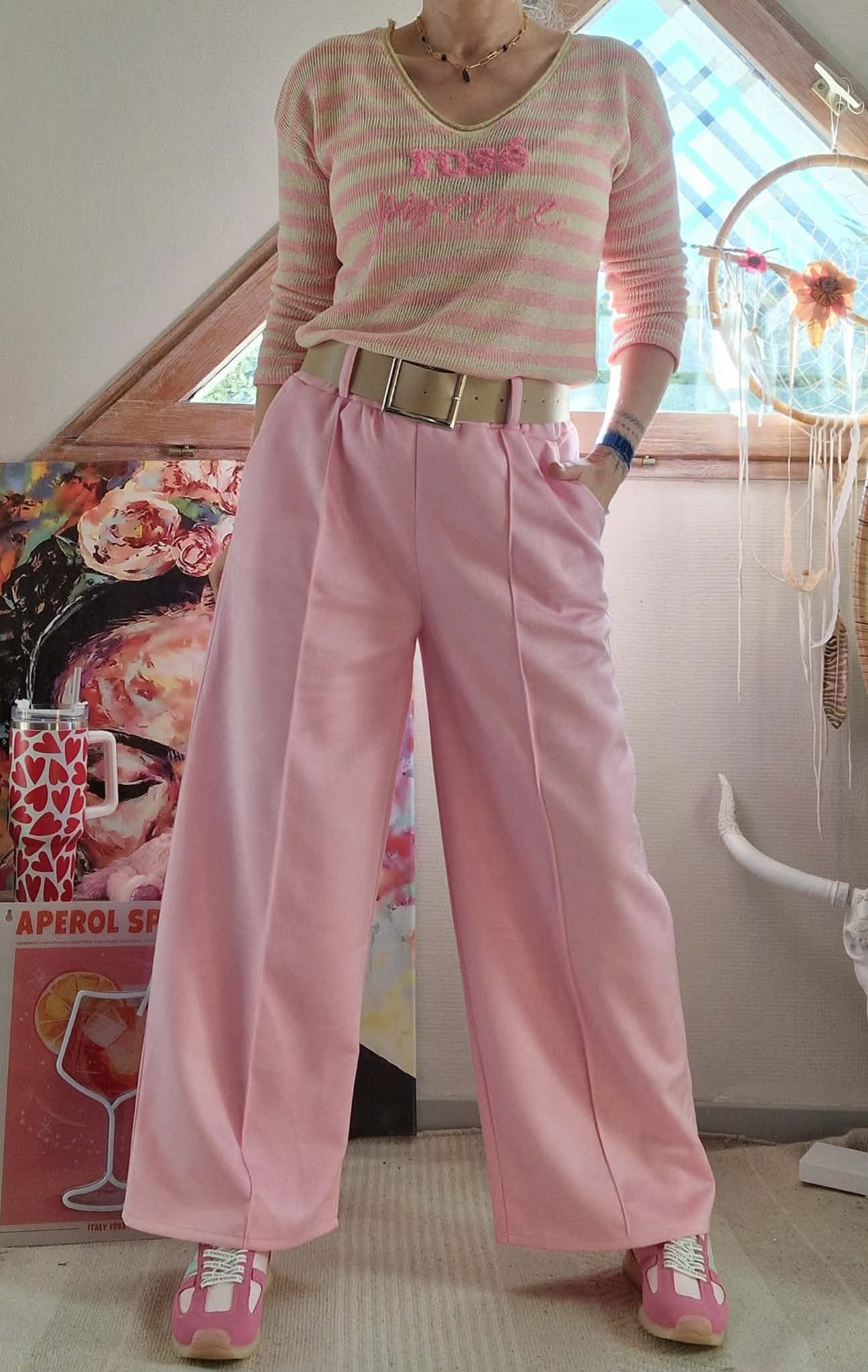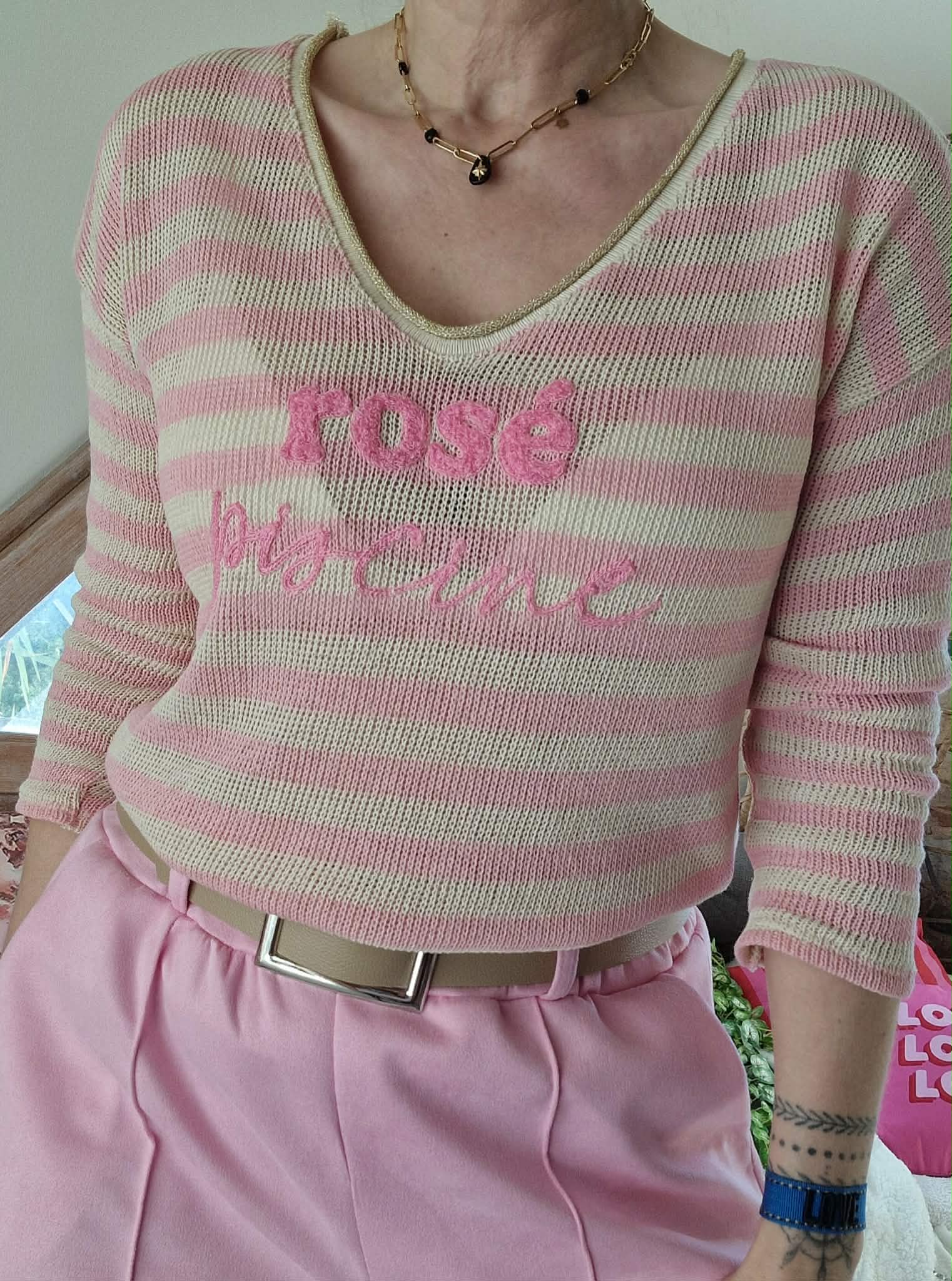 Haut Rosé Piscine rose/beige , col V manches longues.
