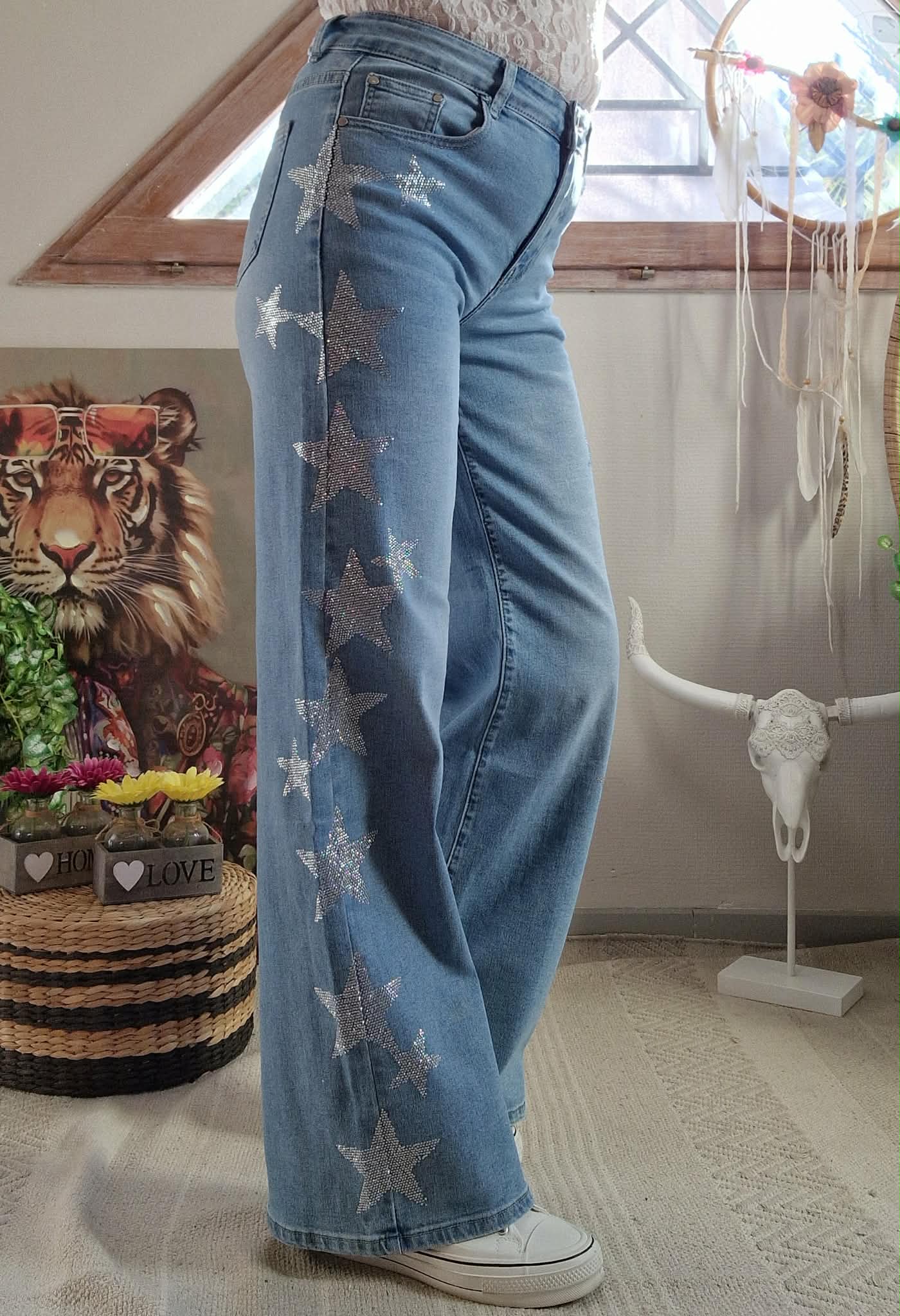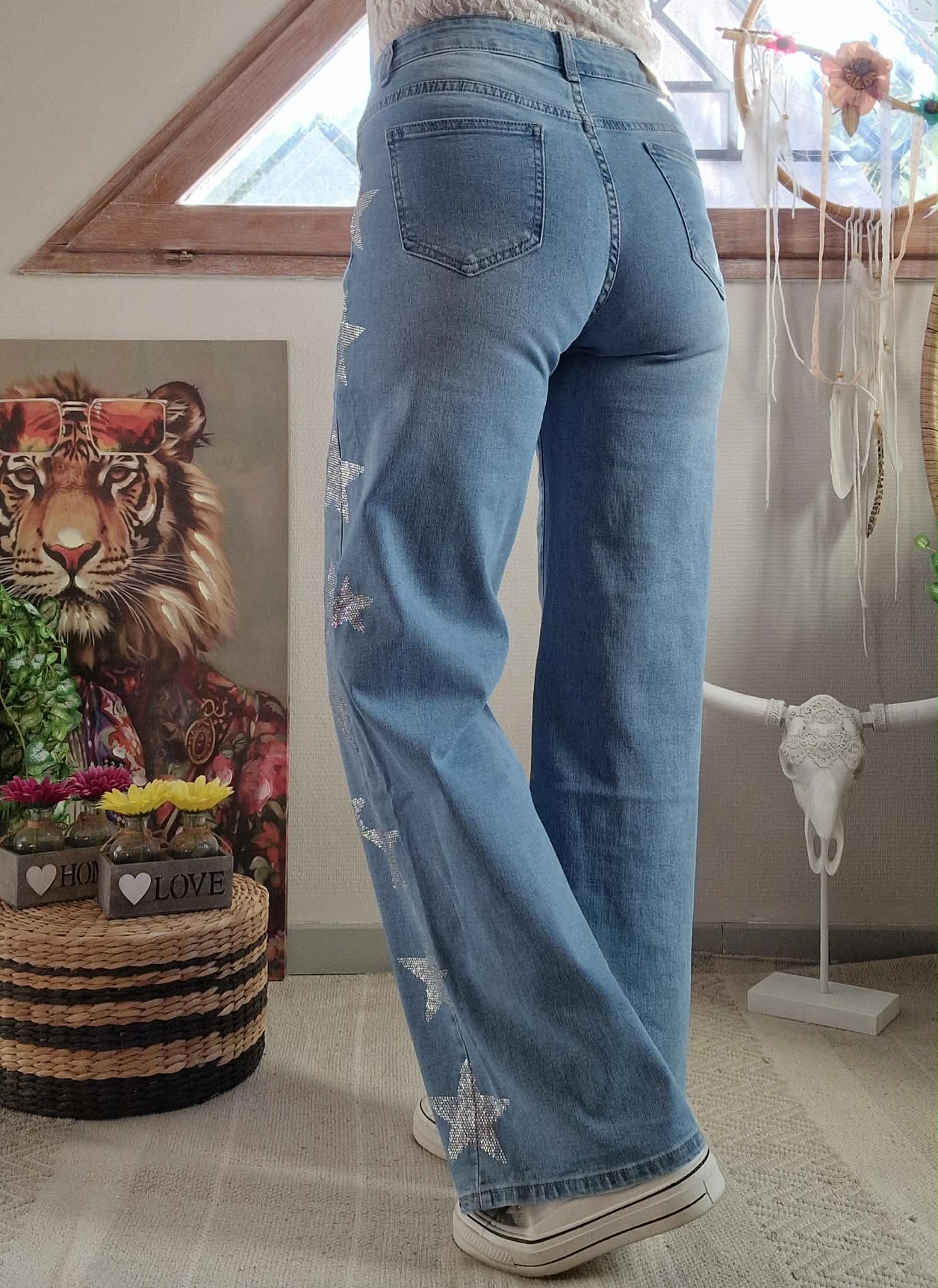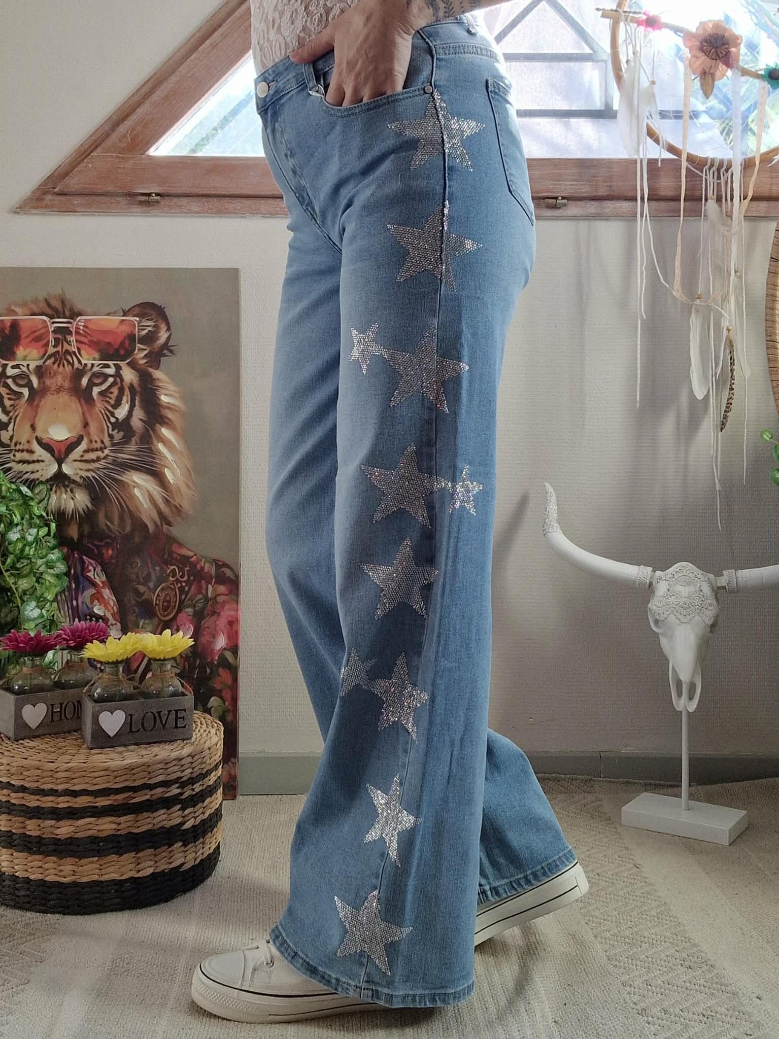 Jeans Stella avec étoile strass sur chaque côté des jambes , taille haute.