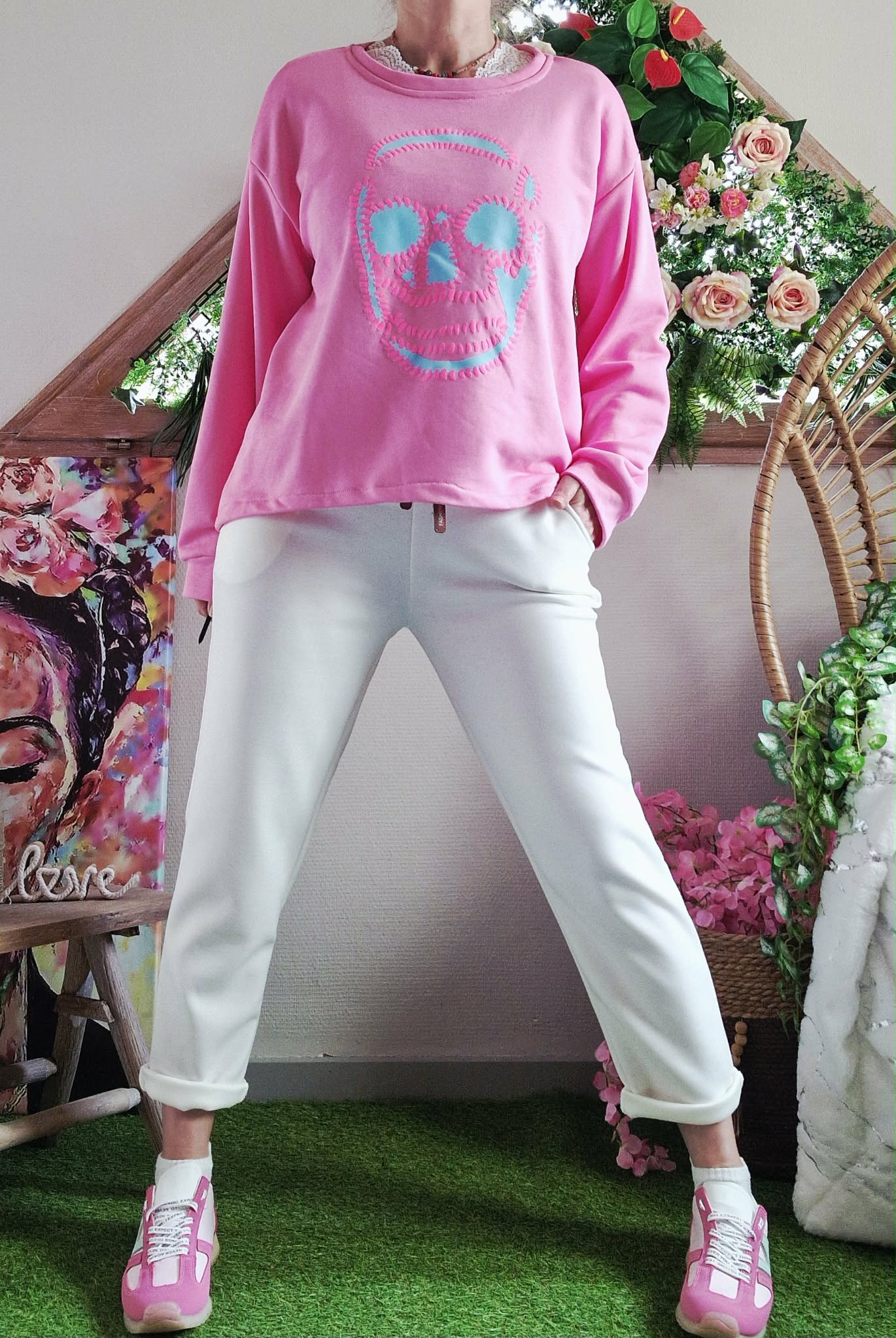 Jogg Alice blanc, taille élastique avec cordon. Poches côté