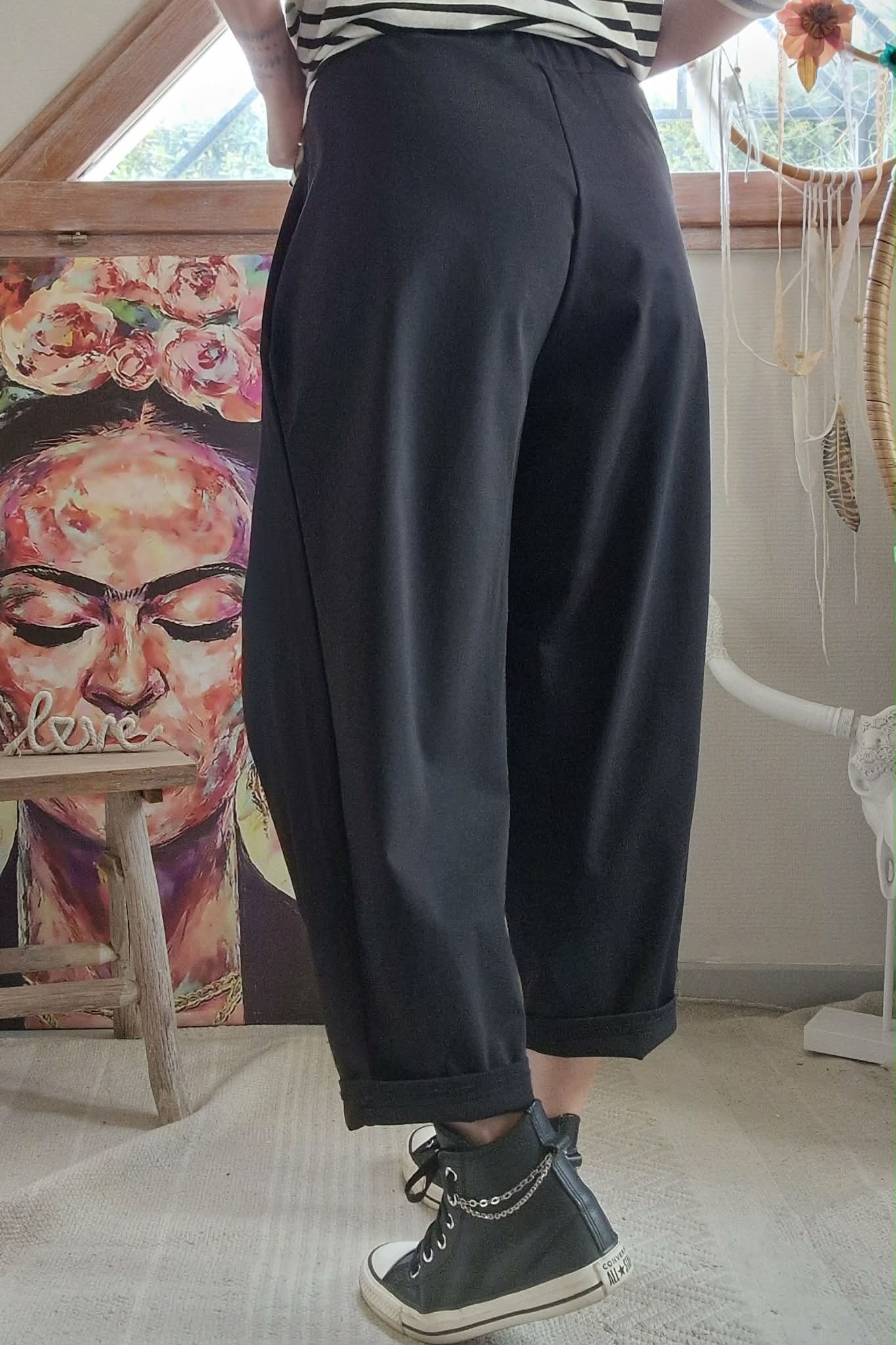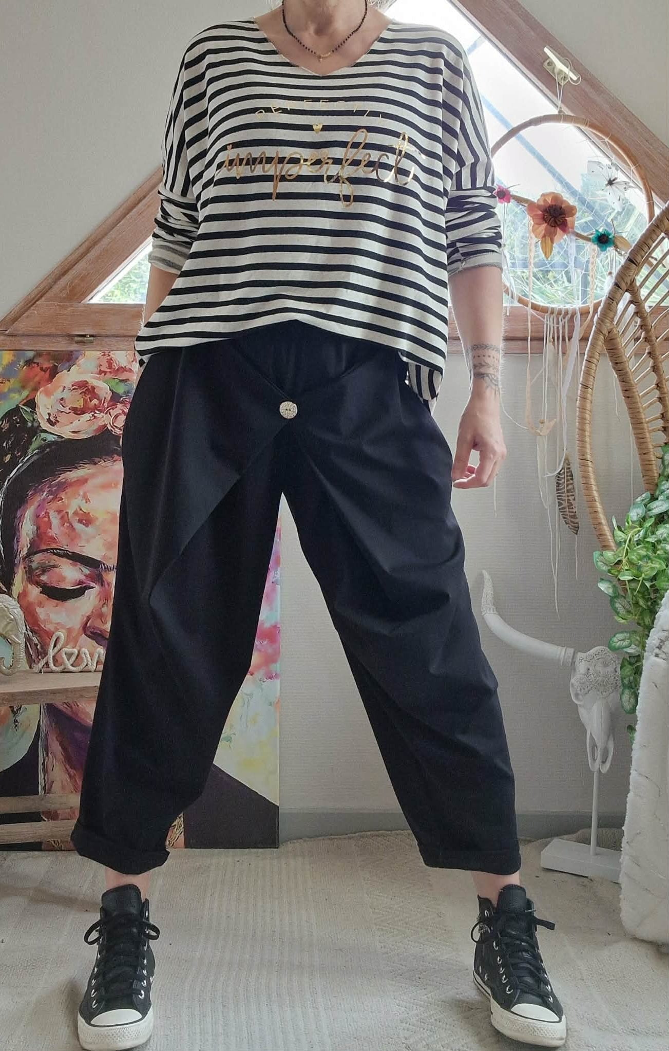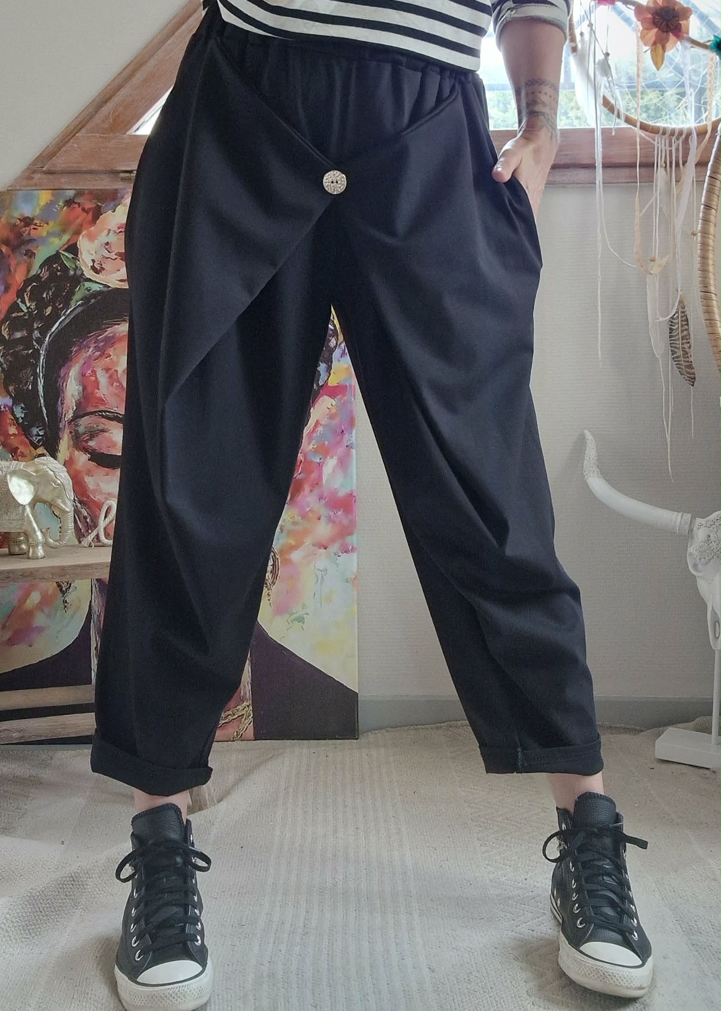 Jogg large noir devant fantaisie avec 1 bouton. Taille élastique et poches côtés.