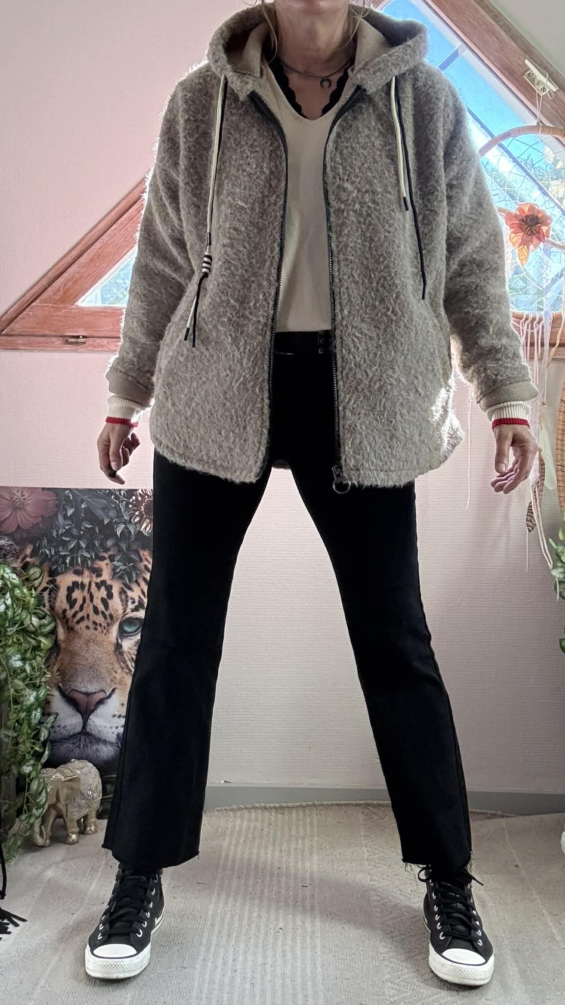 Manteau en laine bouillie Be Your Self dos avec capuche , poches devant et fermeture Zip . Non doublé .