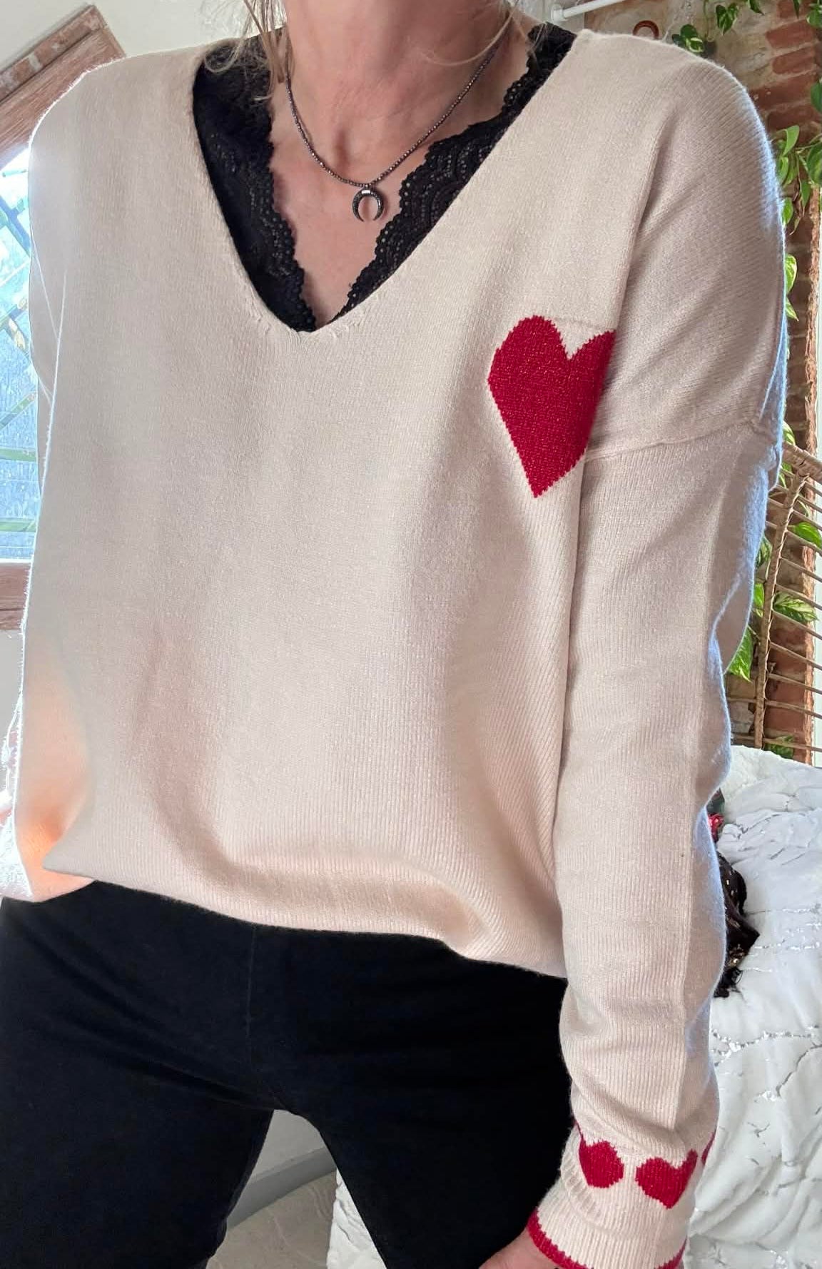 Pull beige Coeur rouge , col V manches longues .
