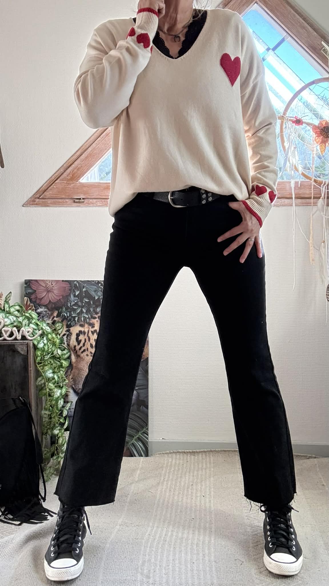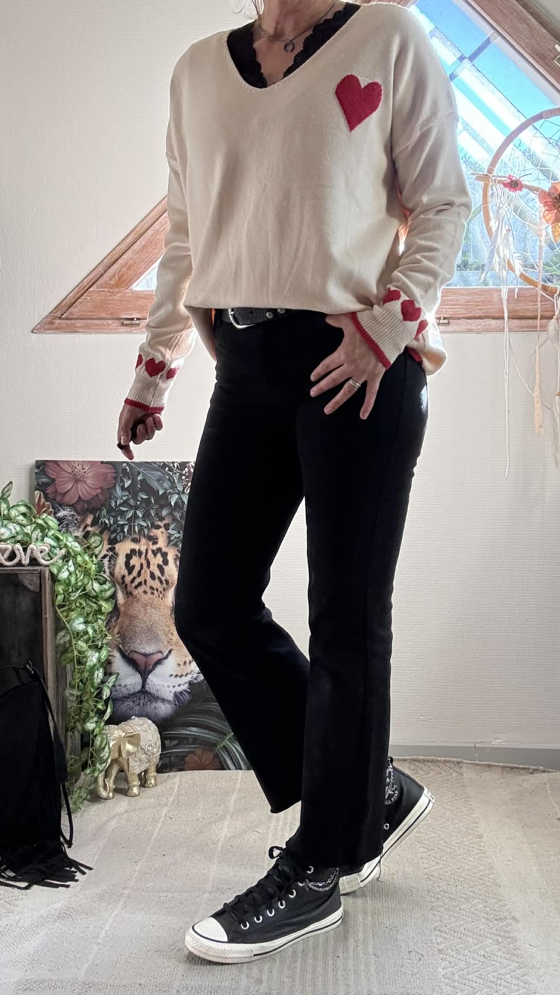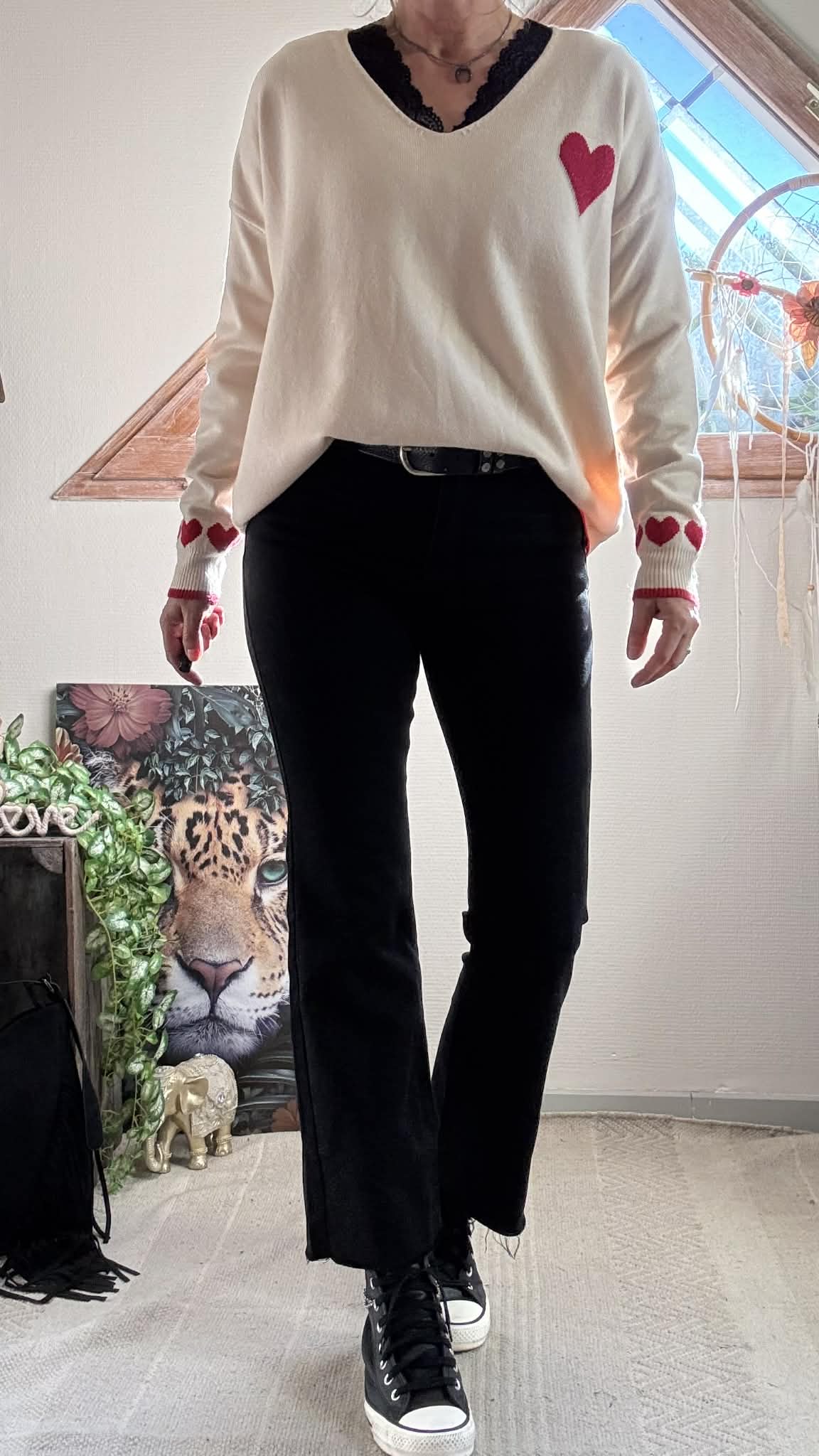 Pull beige coeur rouge