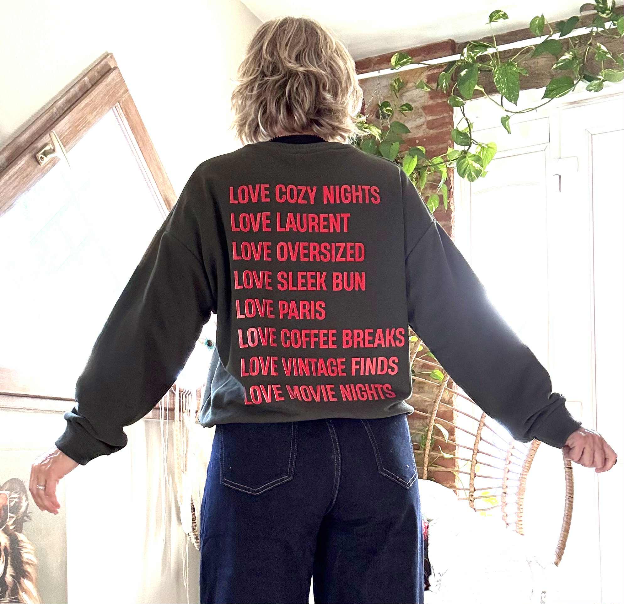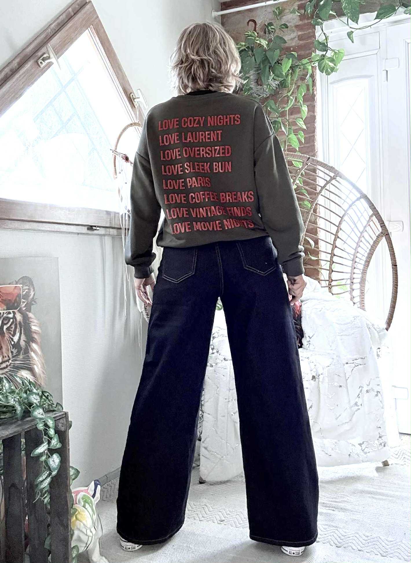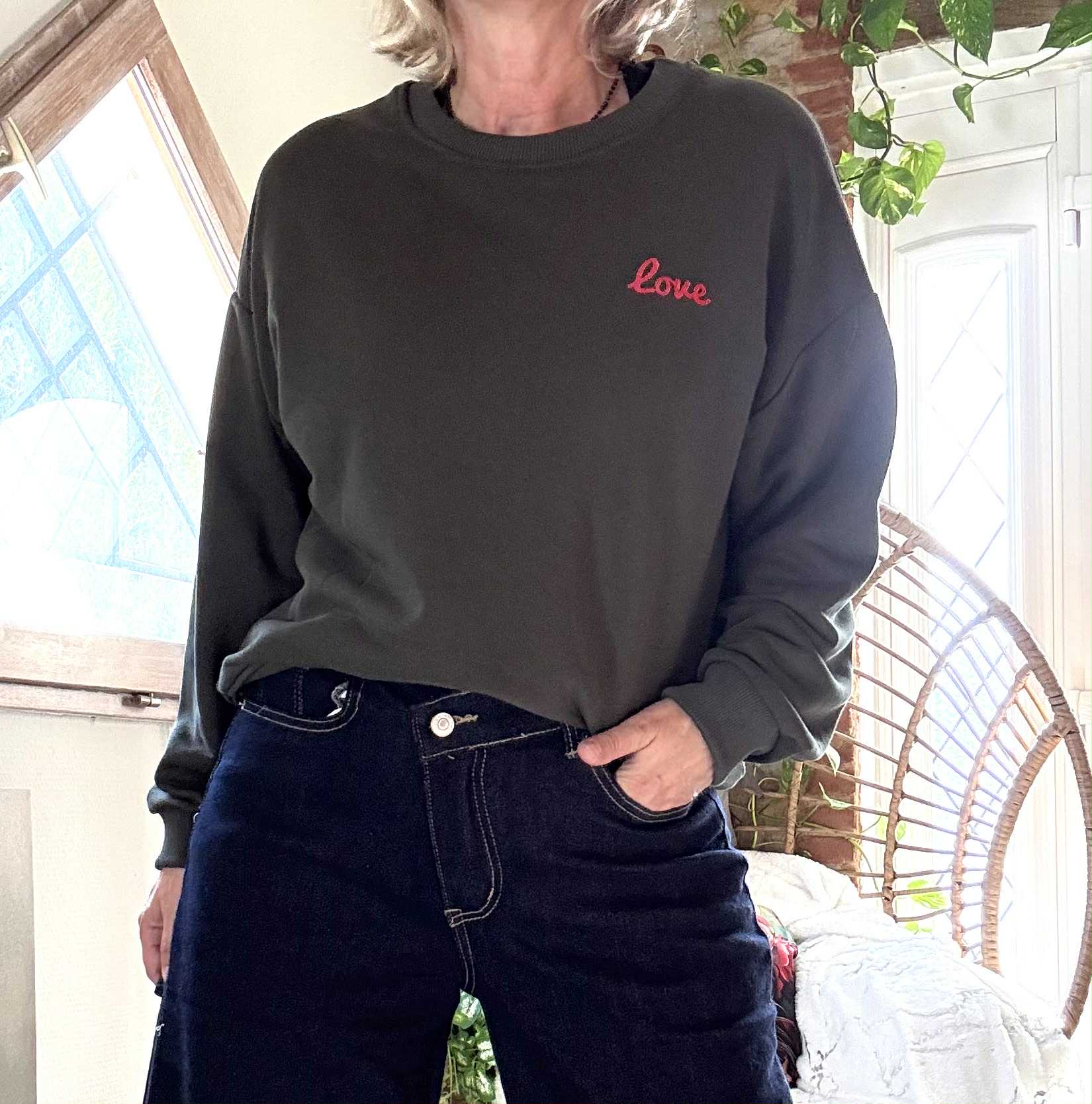 Pull Love couleur kaki avec écriture dos et poitrine. Col rond manches longues.