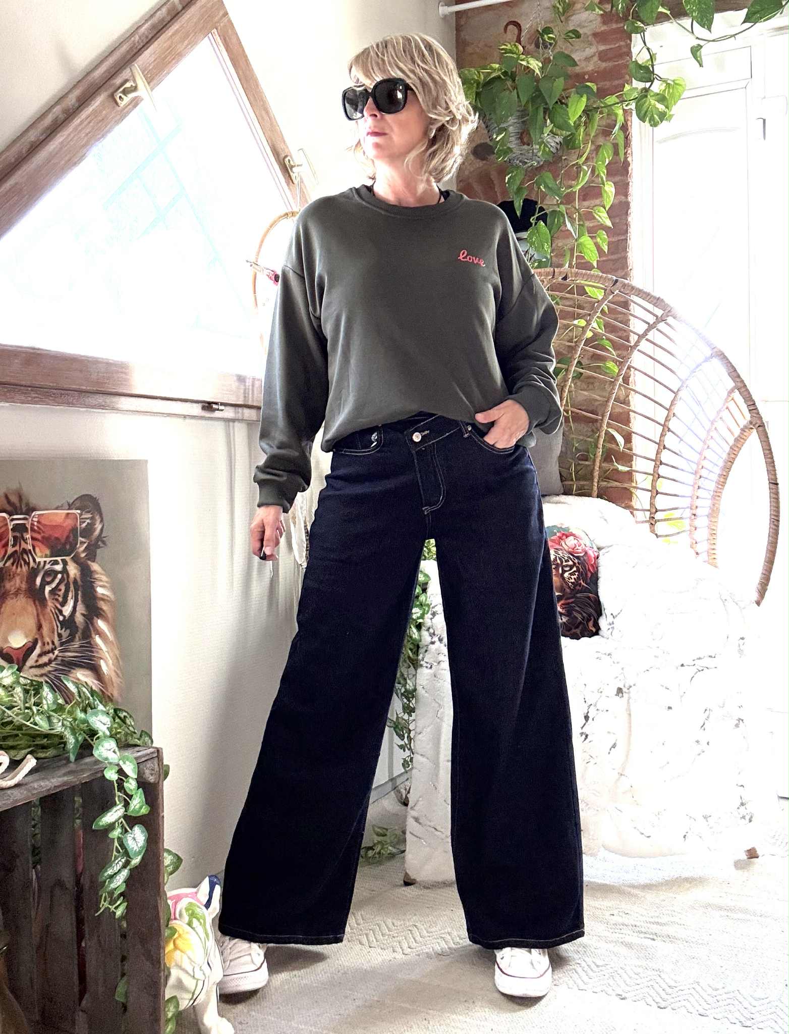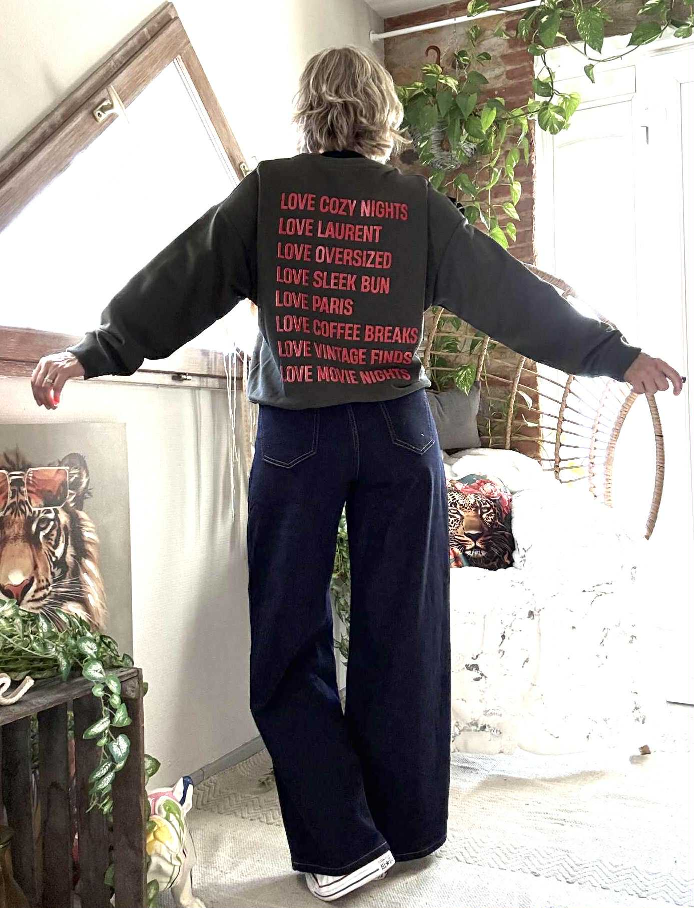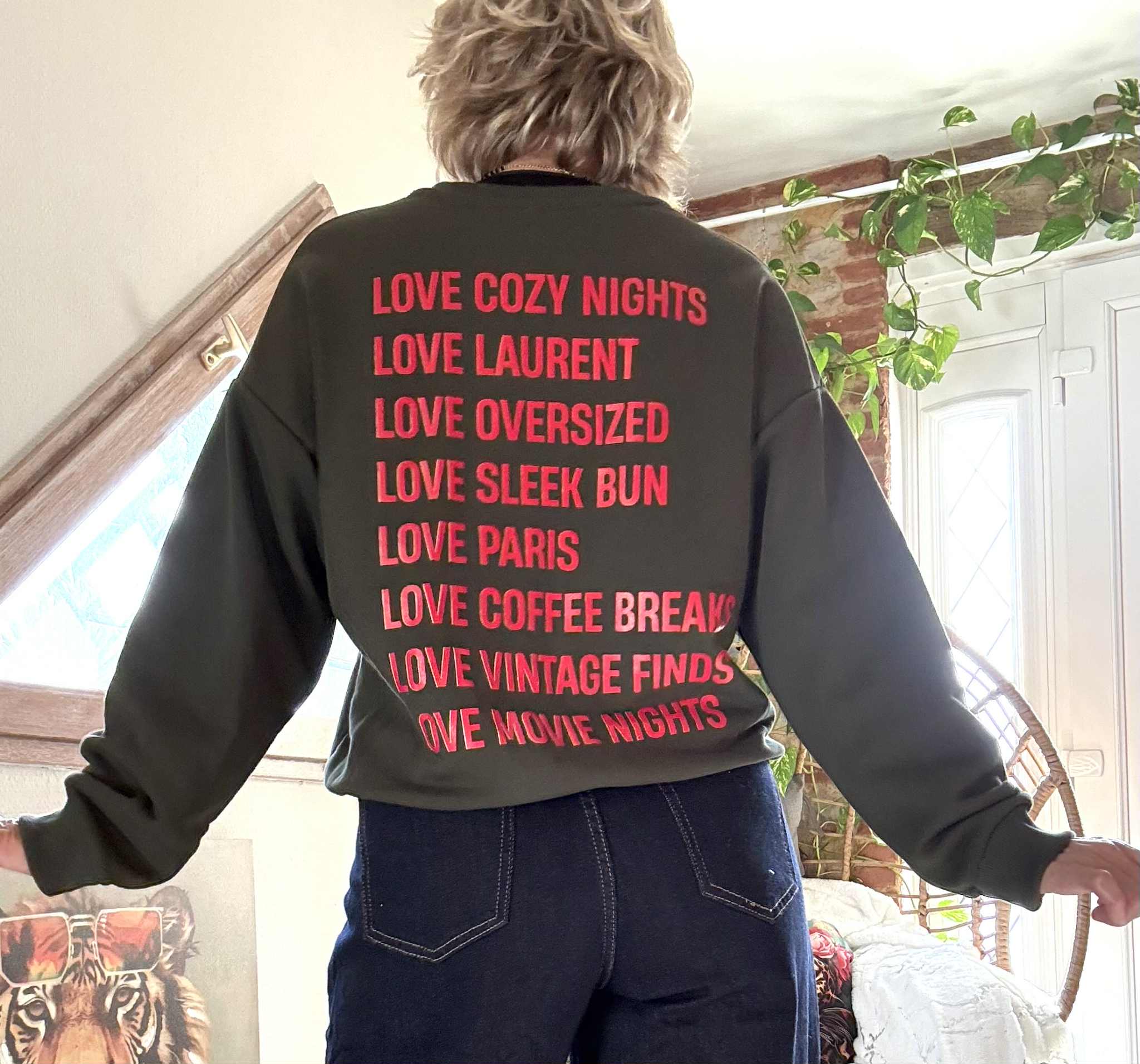 Pull Love couleur kaki avec écriture dos et poitrine. Col rond manches longues.