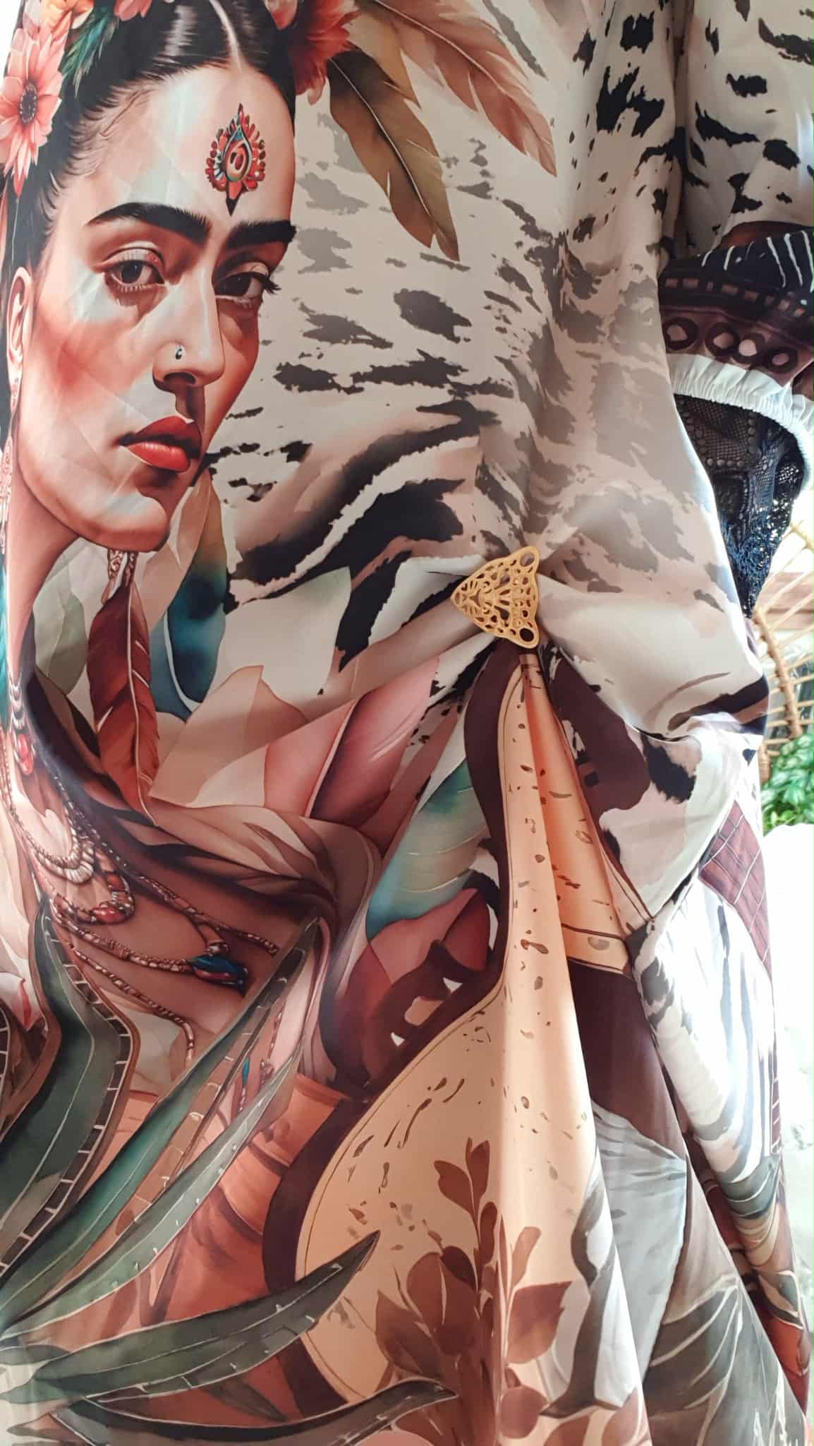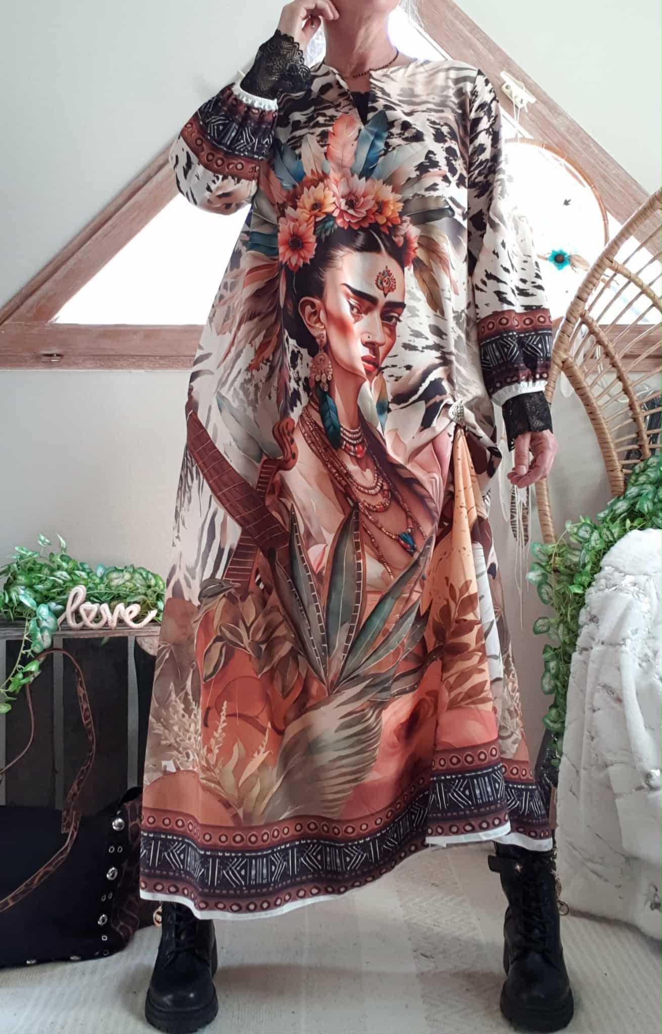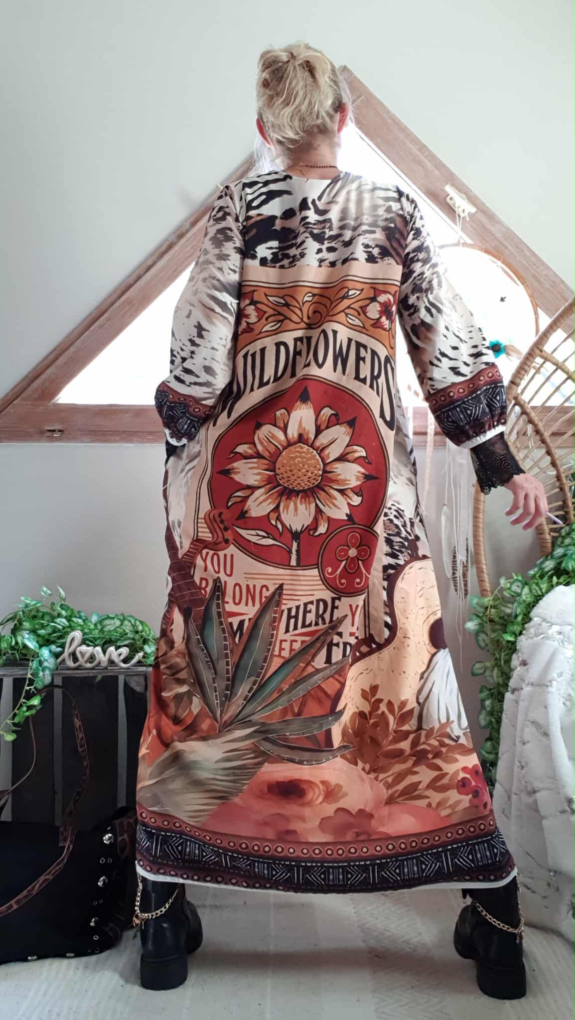 Robe longue Indra , manches longues avec poches côtés et broches fantaisie.