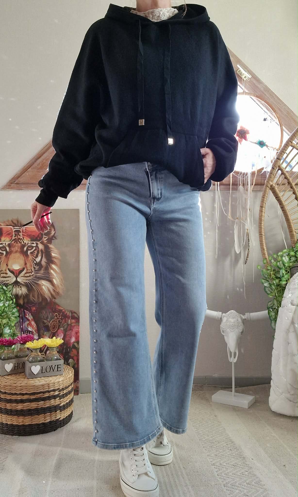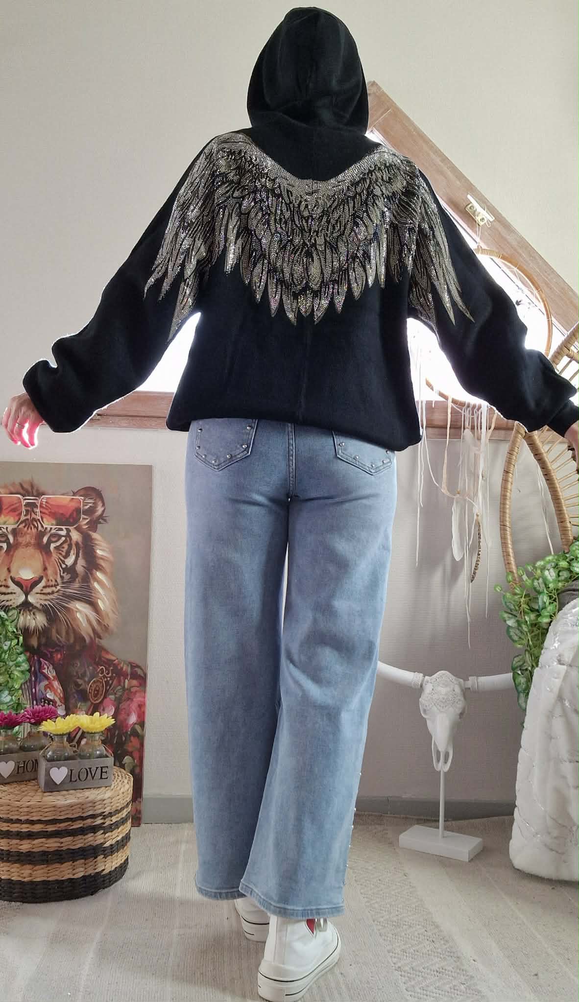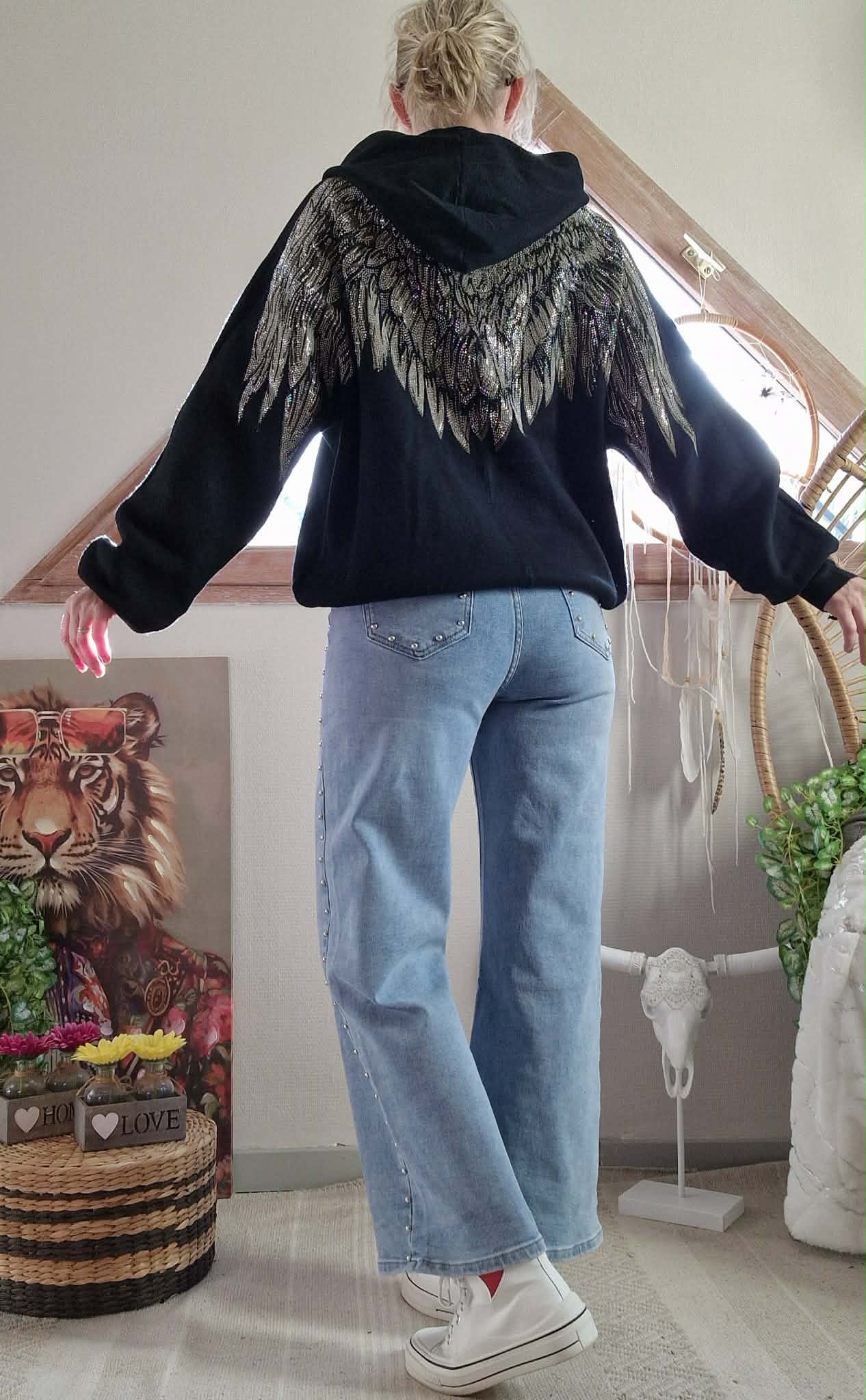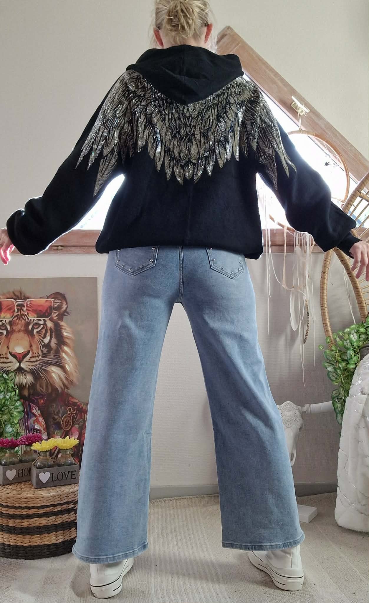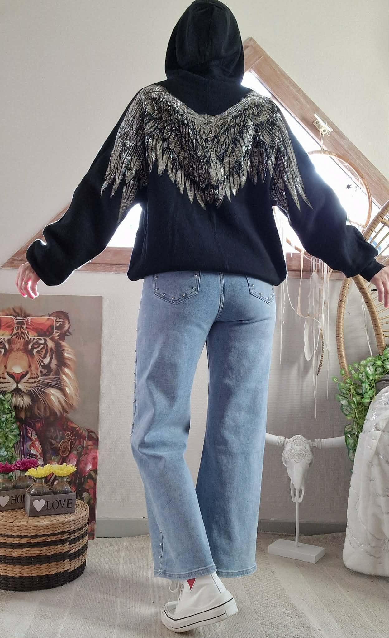 Pull Angel noir à capuche , grande poche devant et dos fantaisie ( Ailes strass )