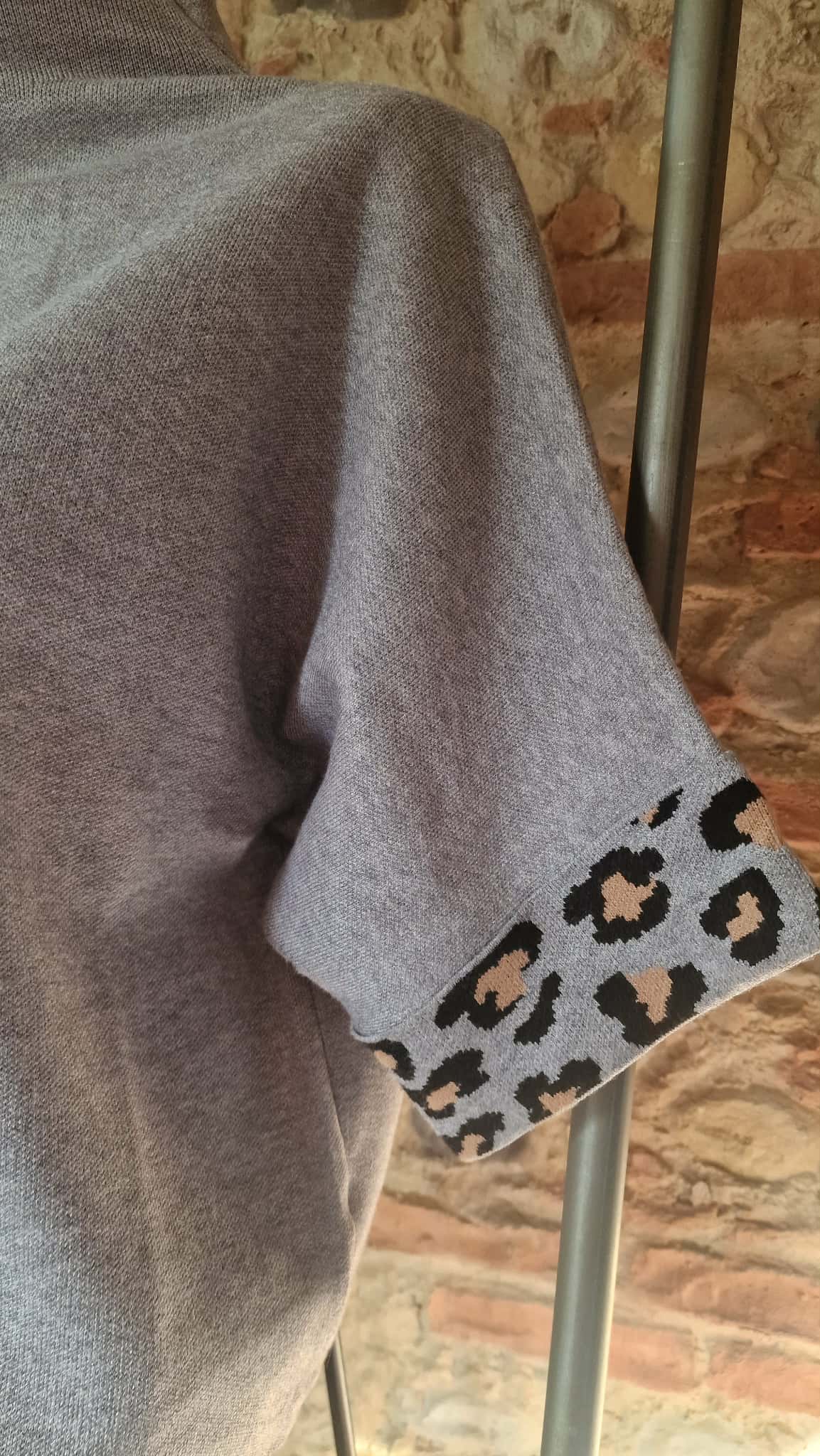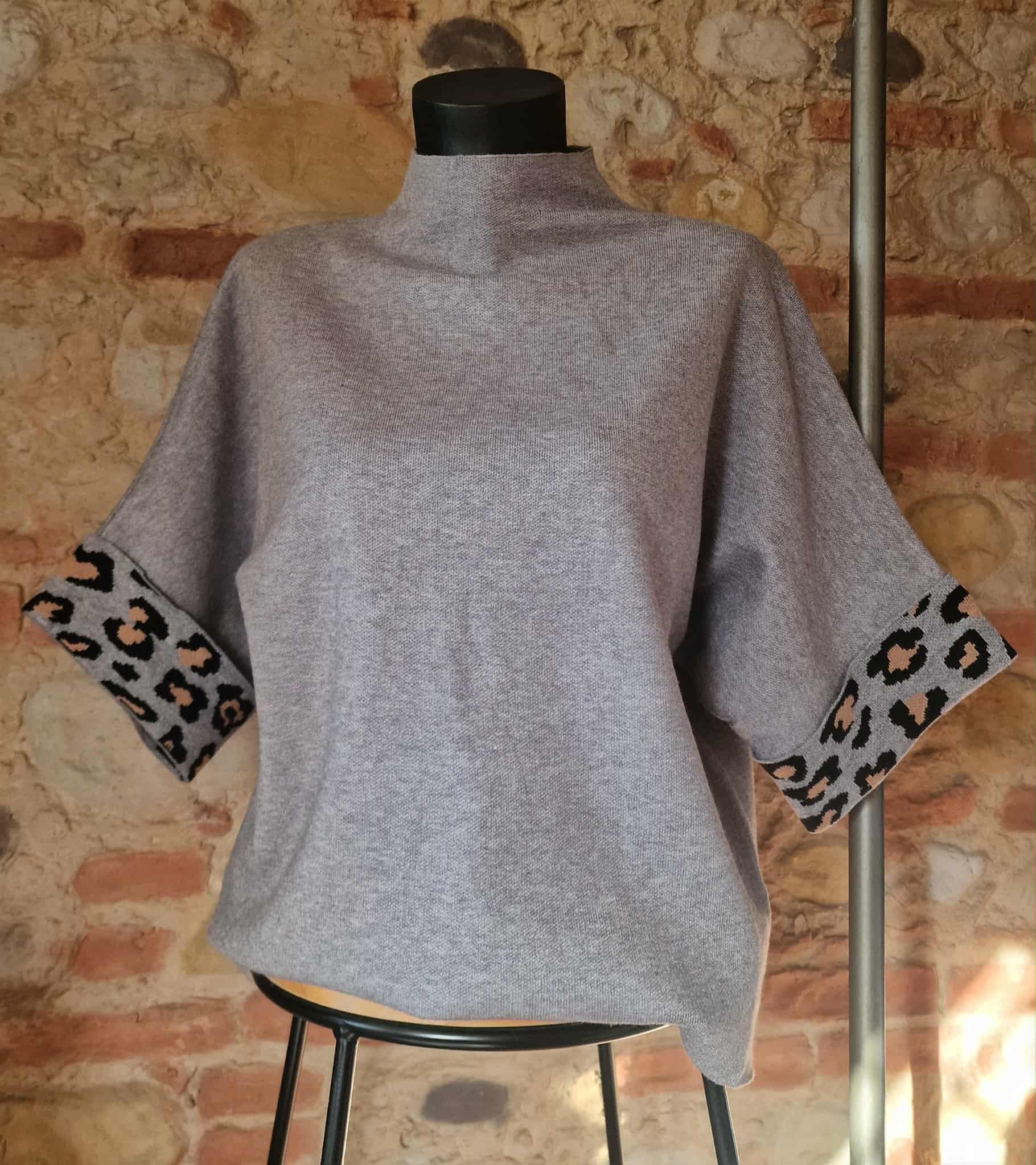 Pull Astrid gris col montant, manches 3/4 et dessin dos et devant.