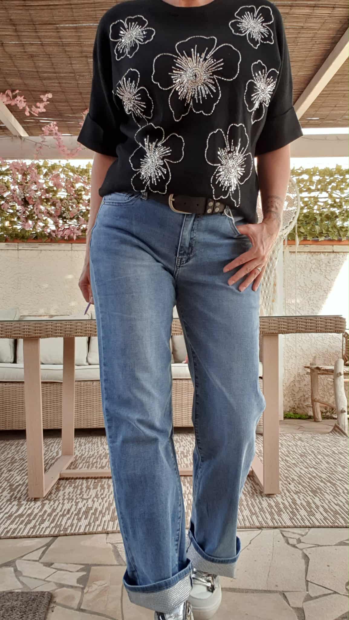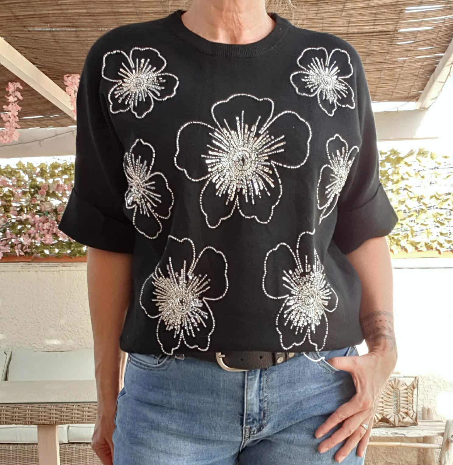 Magnifique pull Mathilde, déco perles devant, col rond manches courtes.