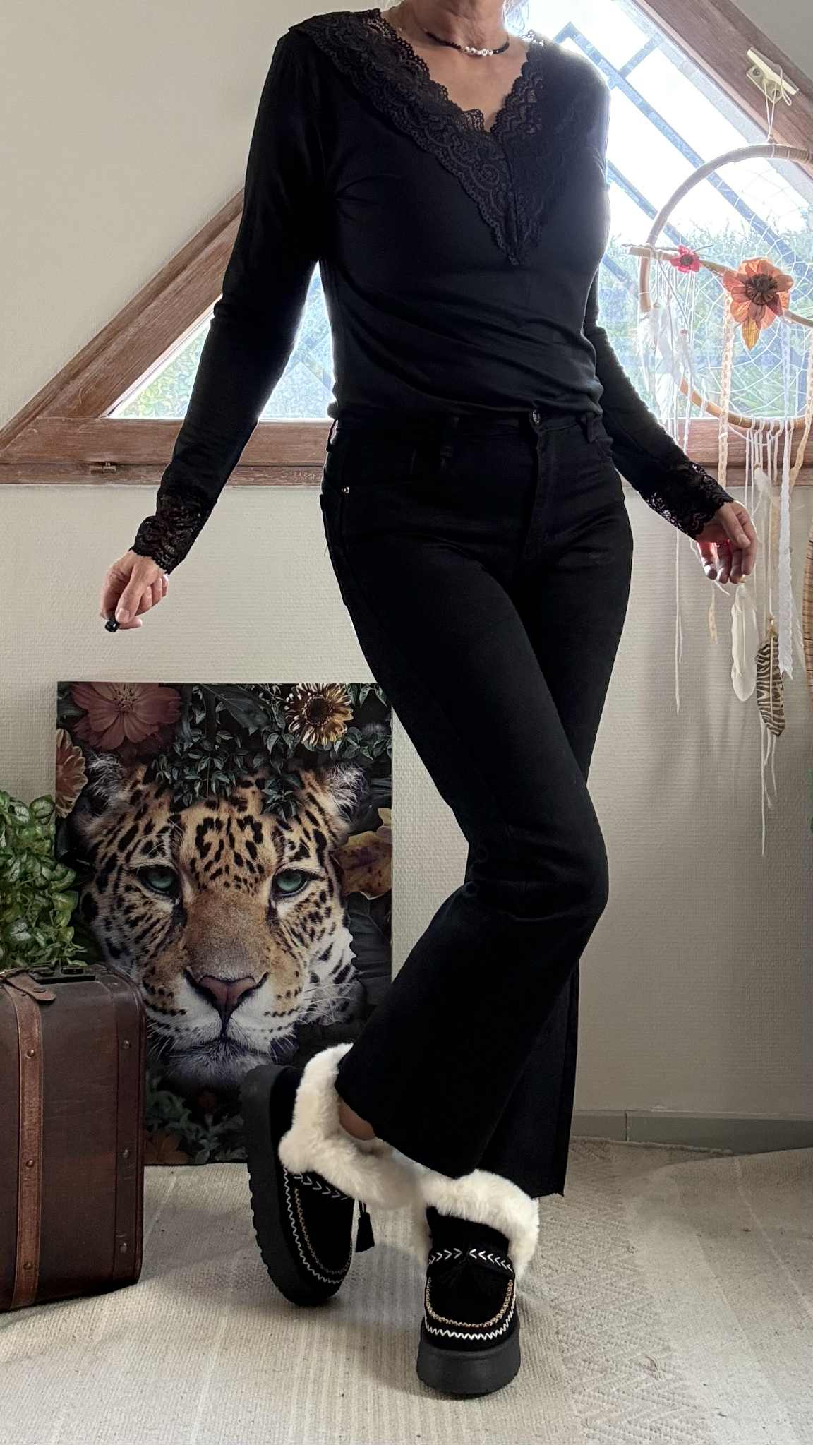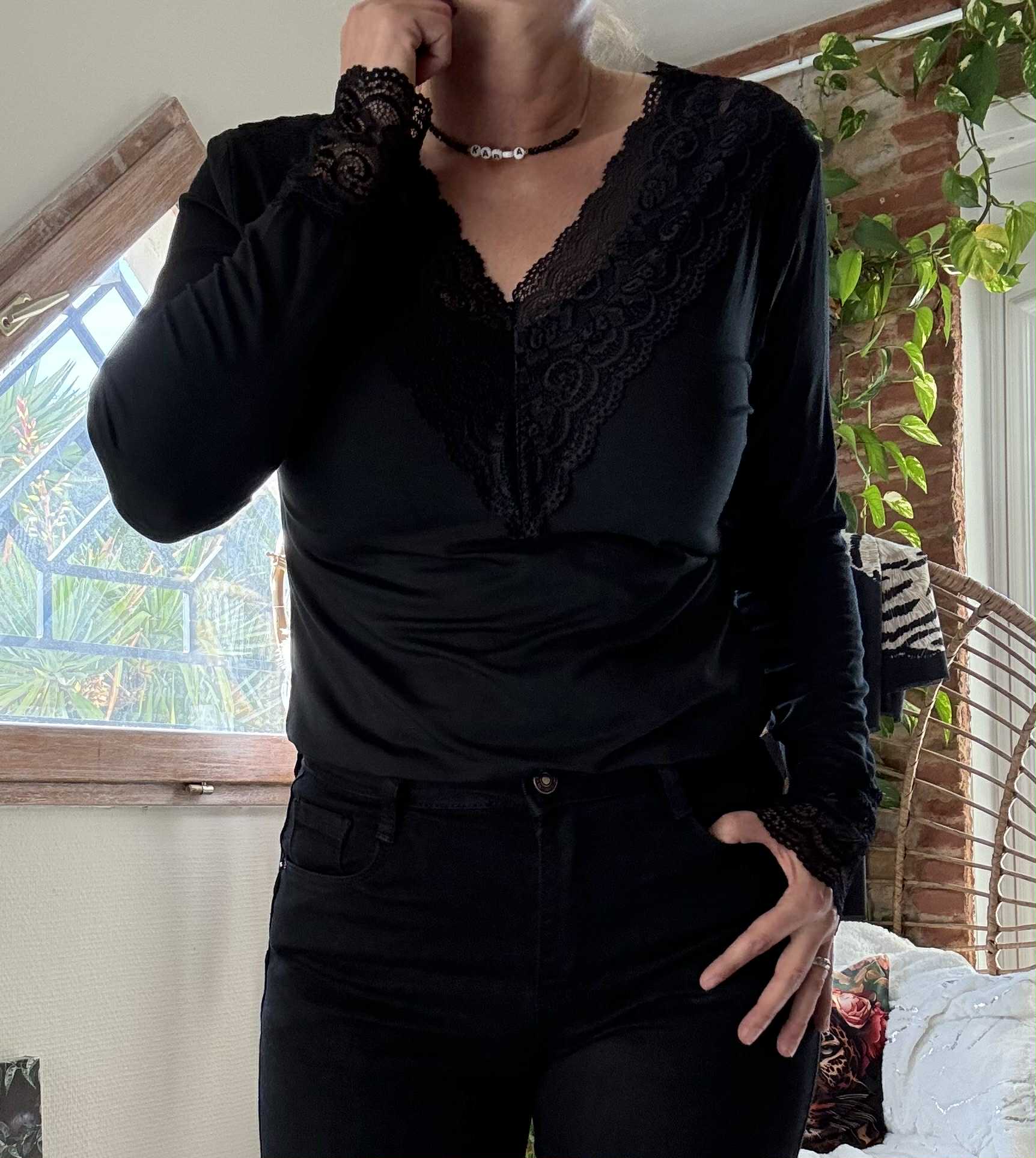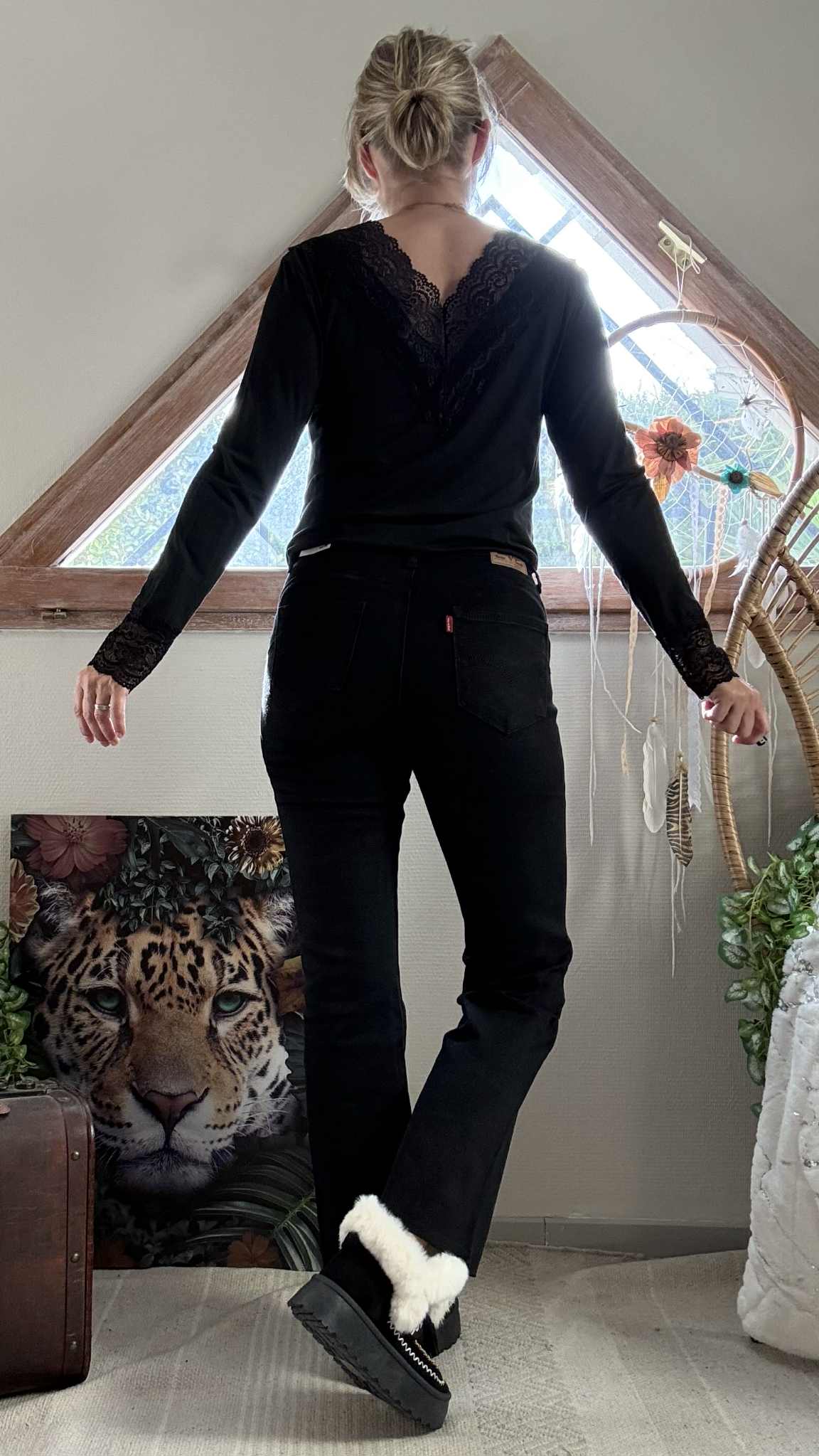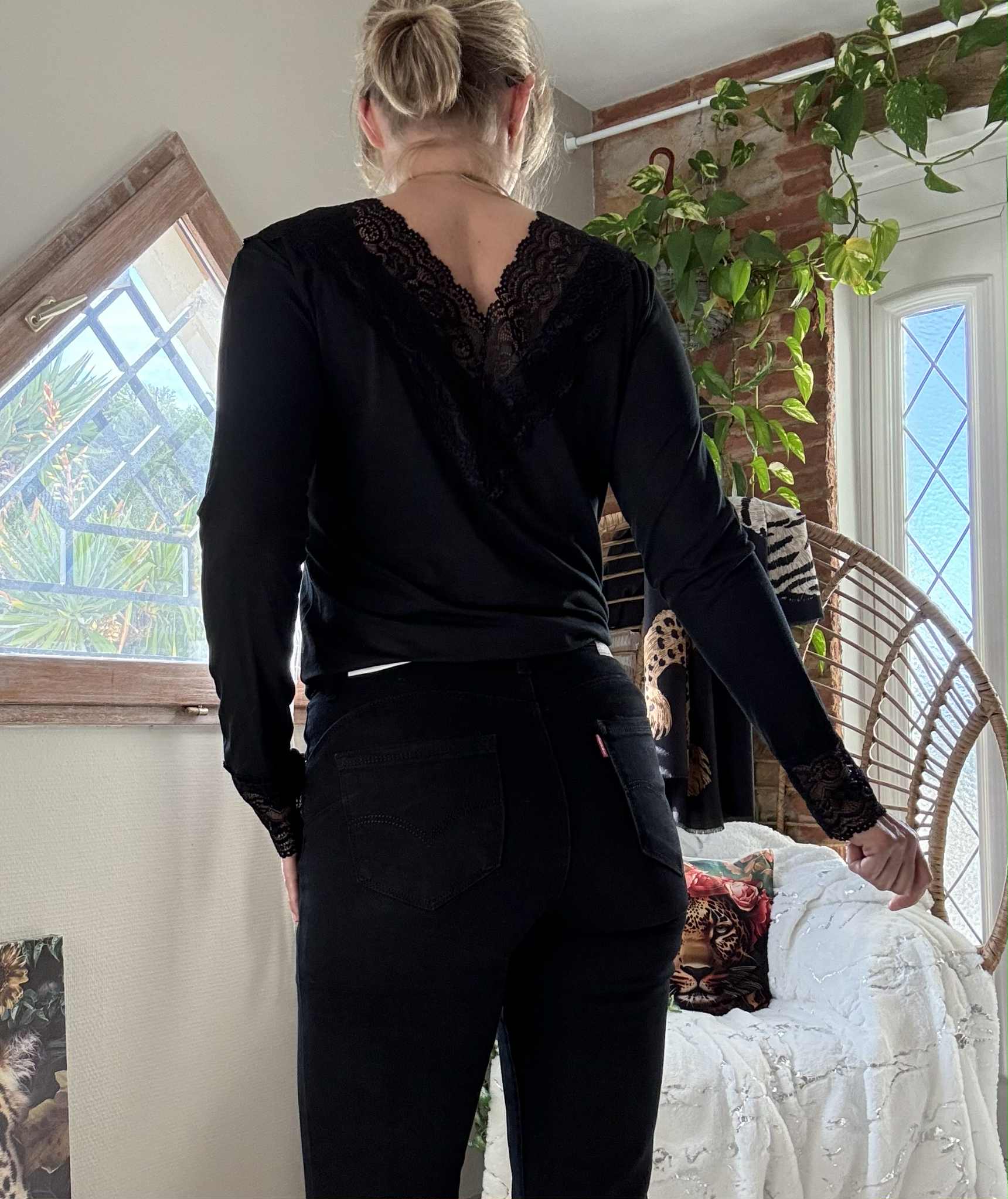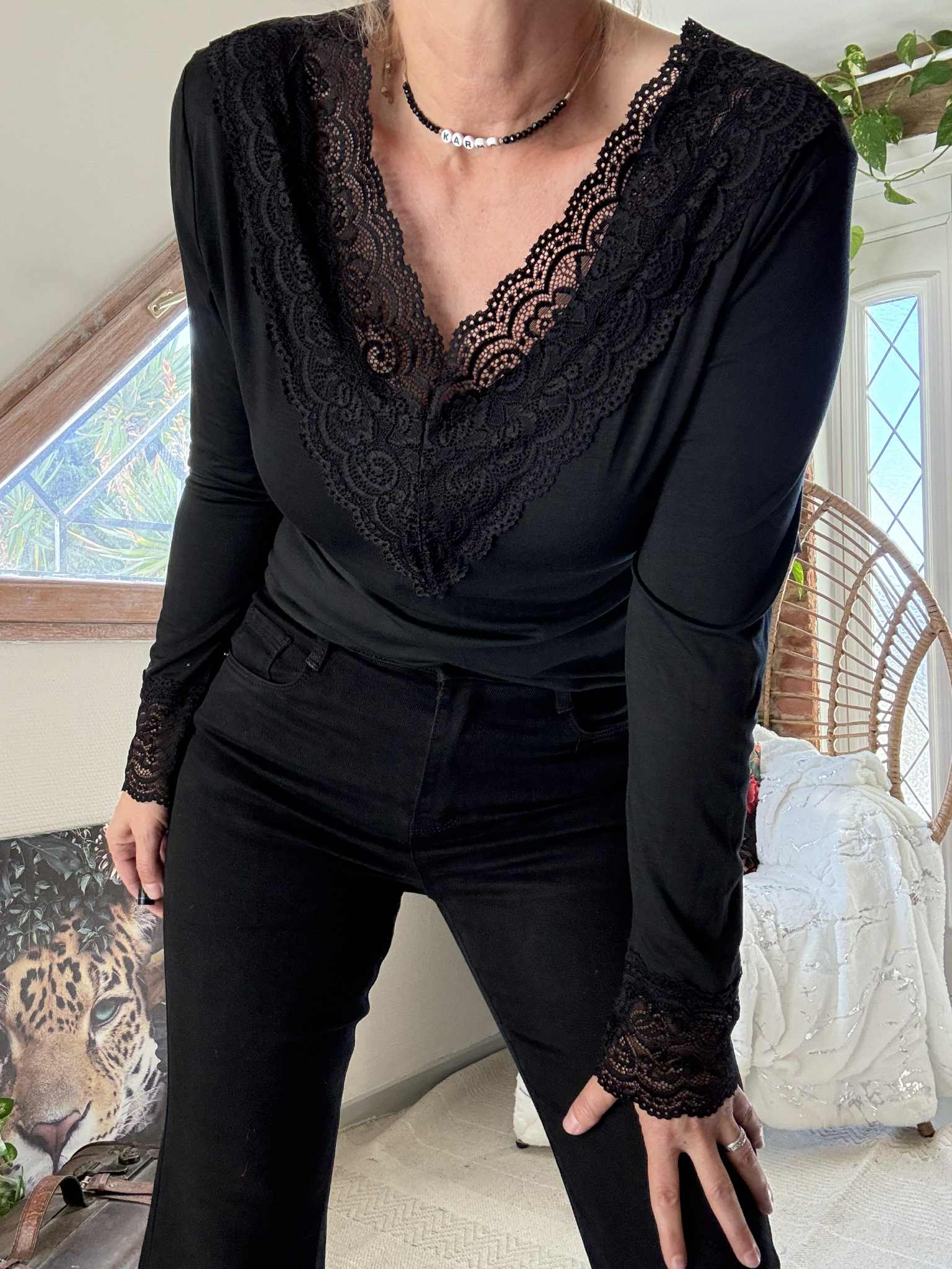Sous-pull Ariana avec dentelles en V devant et dos. Manches longues avec dentelle au poignet.