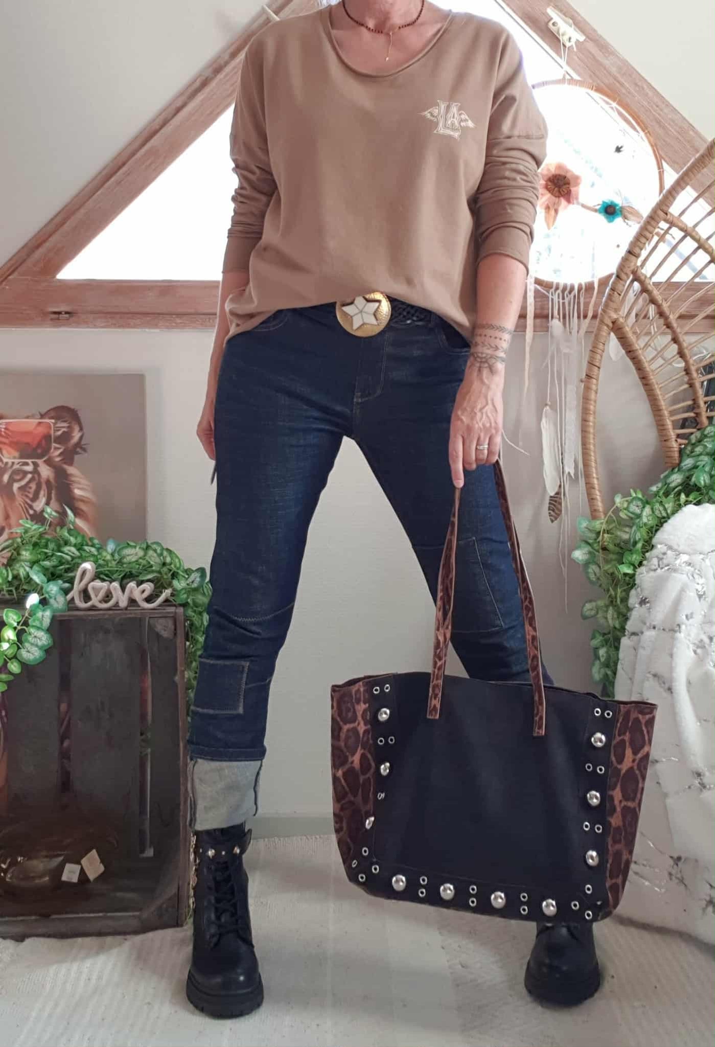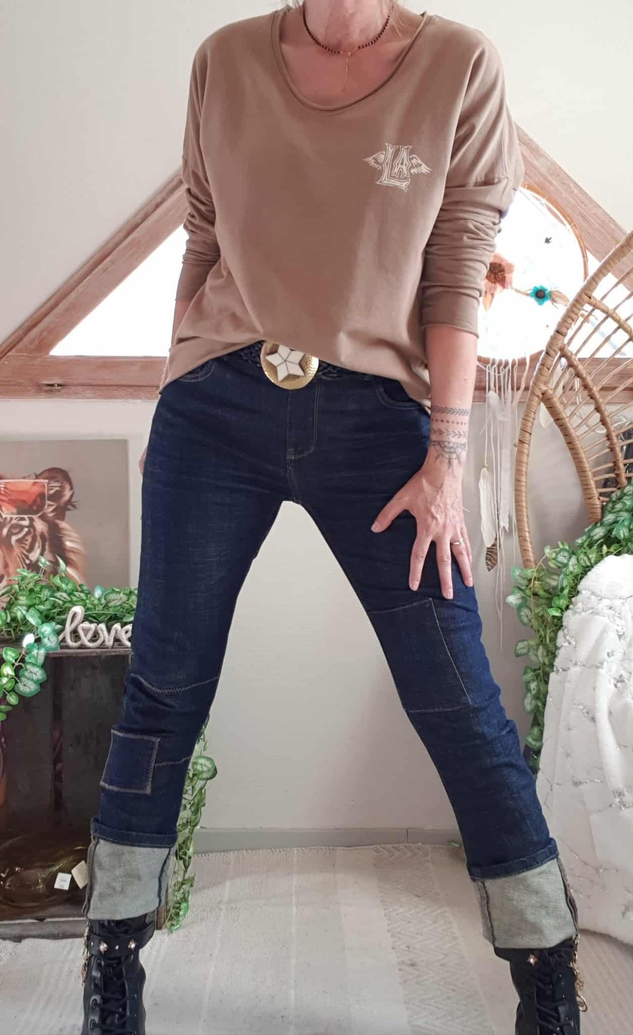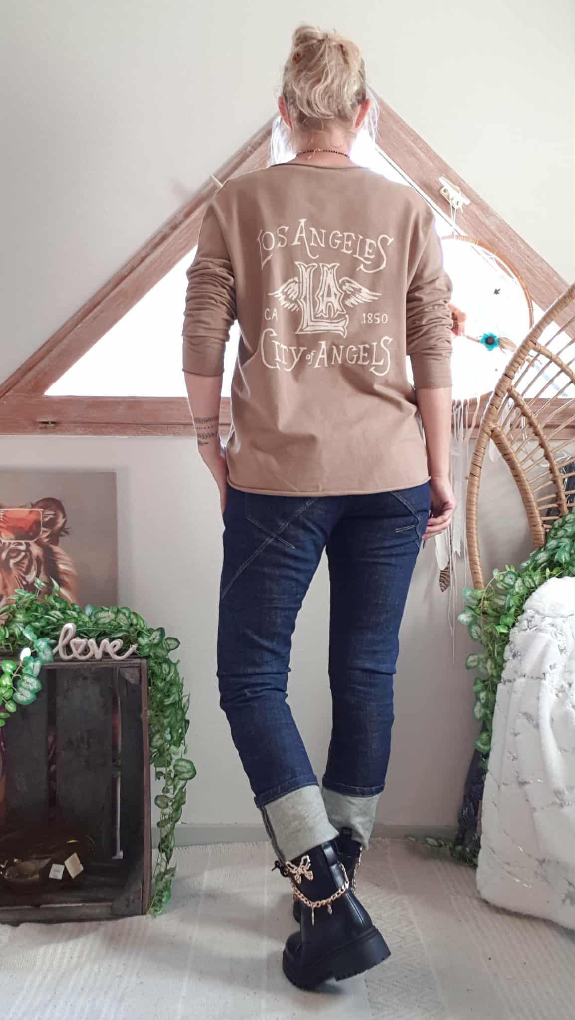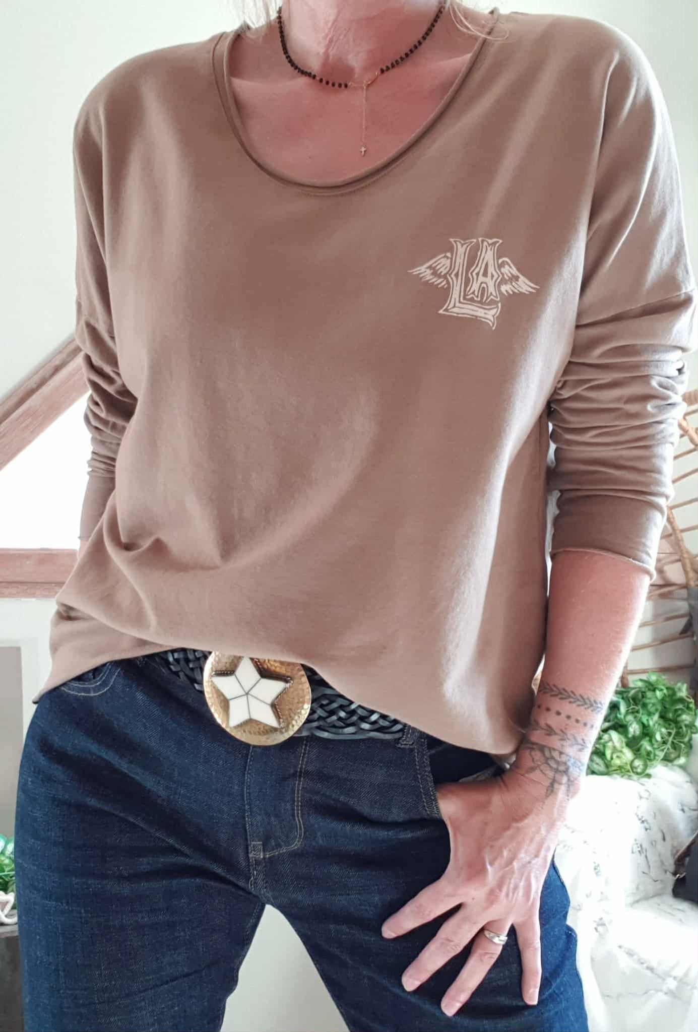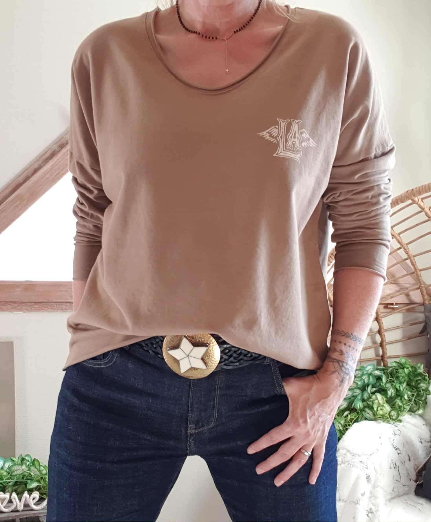 Haut L.A camel col V manches longues. Dessin dos et poitrine.